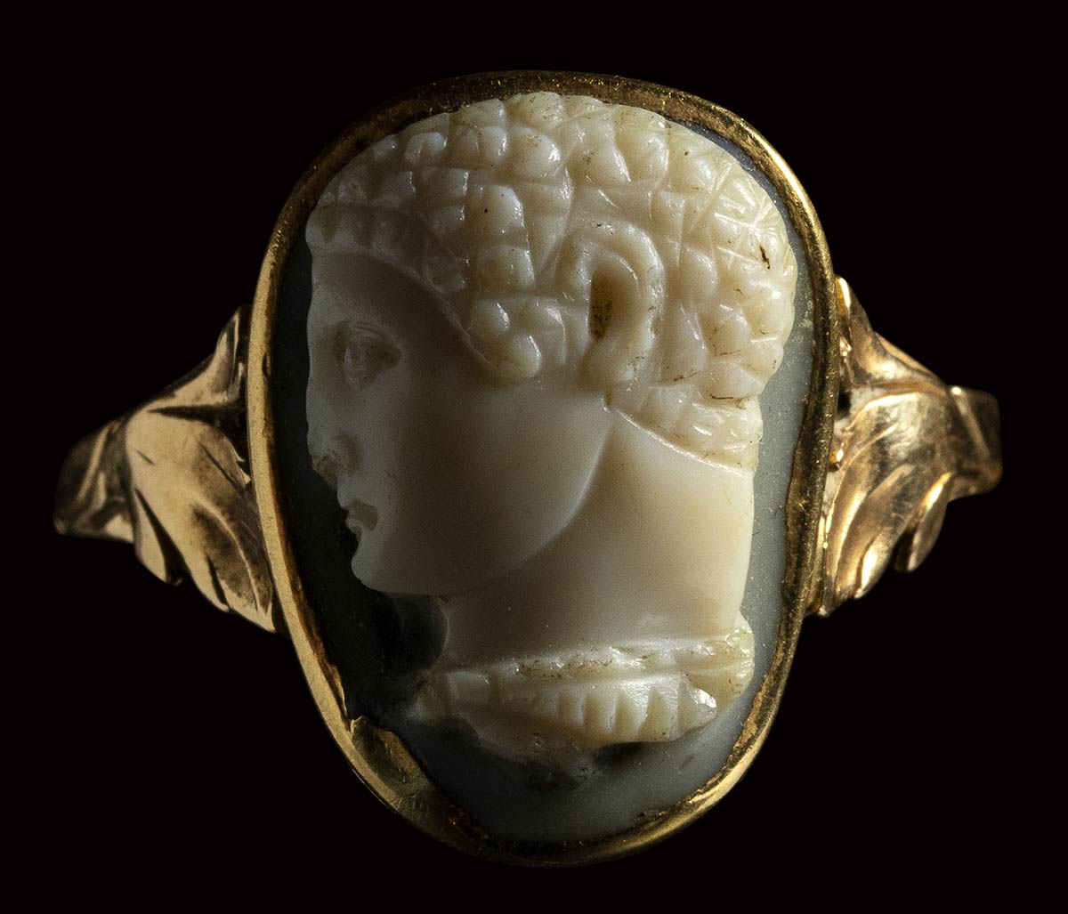 A fine roman onyx cameo set in a later gold ring. Hercules bust. <br><br>2nd - 3rd century A.D.