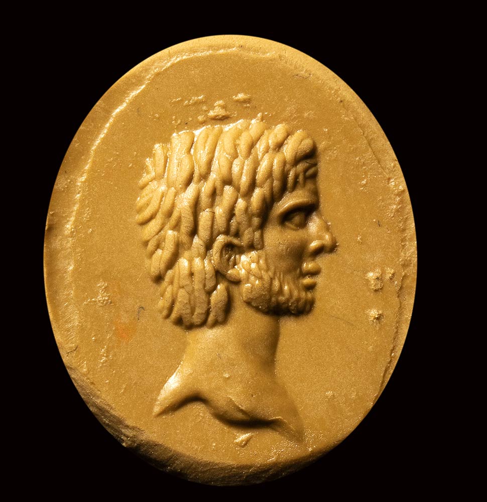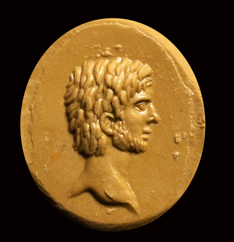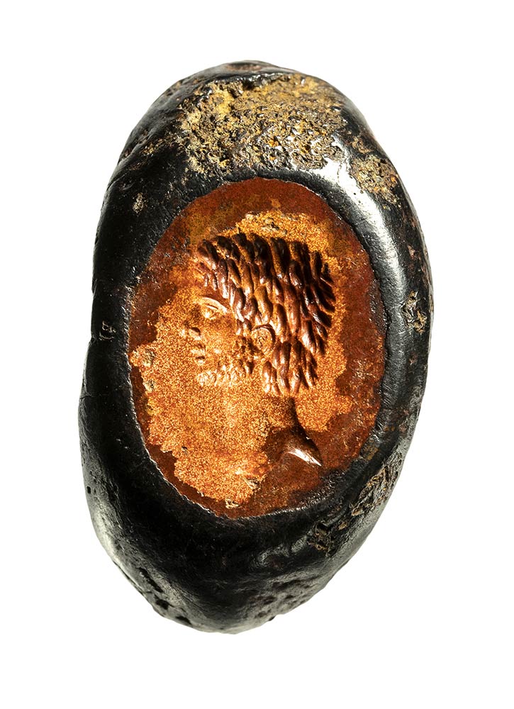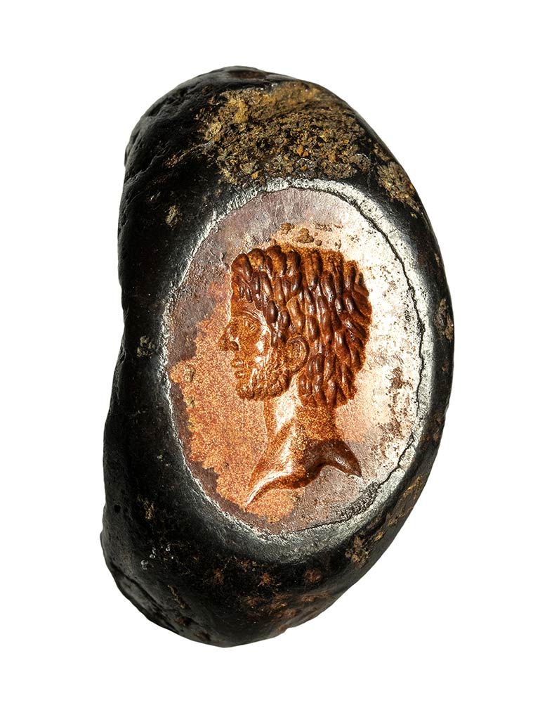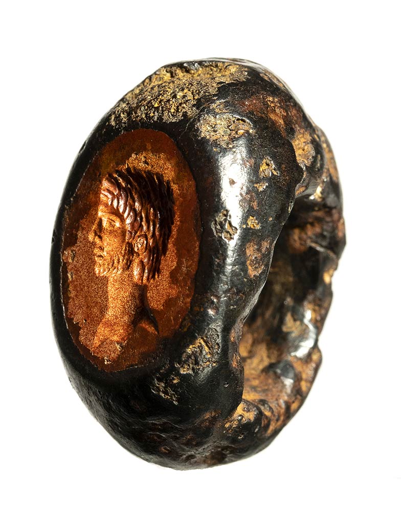 Beautiful male portrait, facing left, engraved with depth in the stone. The gem has traces of burning and deposits of ferrous oxydes that have penetrated its surface. The stone is still inside its original iron ring, which shows strong corrosion and oxydation. The juvenile portrait is referable to the Severian period, between the period of Pescennio Nigro and Settimio Severo. The fashion of the hair and beard still has influences from the Hadrian and Antonine period, but the stylistic characteristics reveal its belonging more to the end of the second century AD. Fine male portrait, probably a member of the aristocracy in the military elite, near the emperor's family. Rare. Parallel: M-L. Volleinweider, Camées et intailles. Les Portraits romains du Cabinet des médailles. Tome II, p. 115 n. 220, p. 118 n. 225,226 ss.