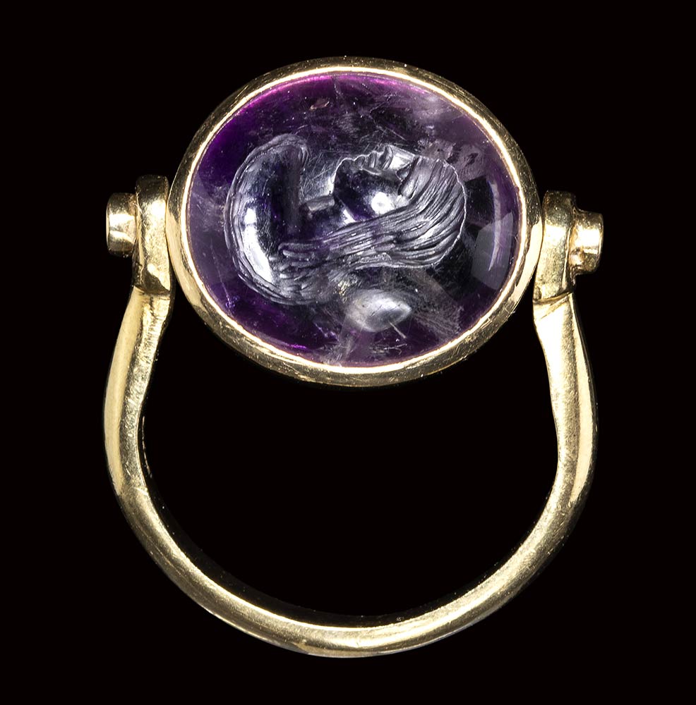 A roman amethyst intaglio set in a modern gold ring with diamonds. Bust of Nereid. <br><br>1st century B.C. - 1st century A.D.