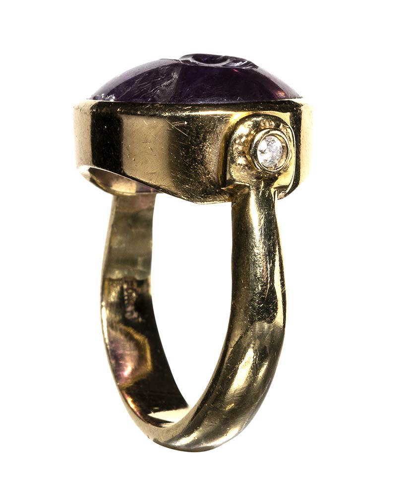 A roman amethyst intaglio set in a modern gold ring with diamonds. Bust of Nereid.