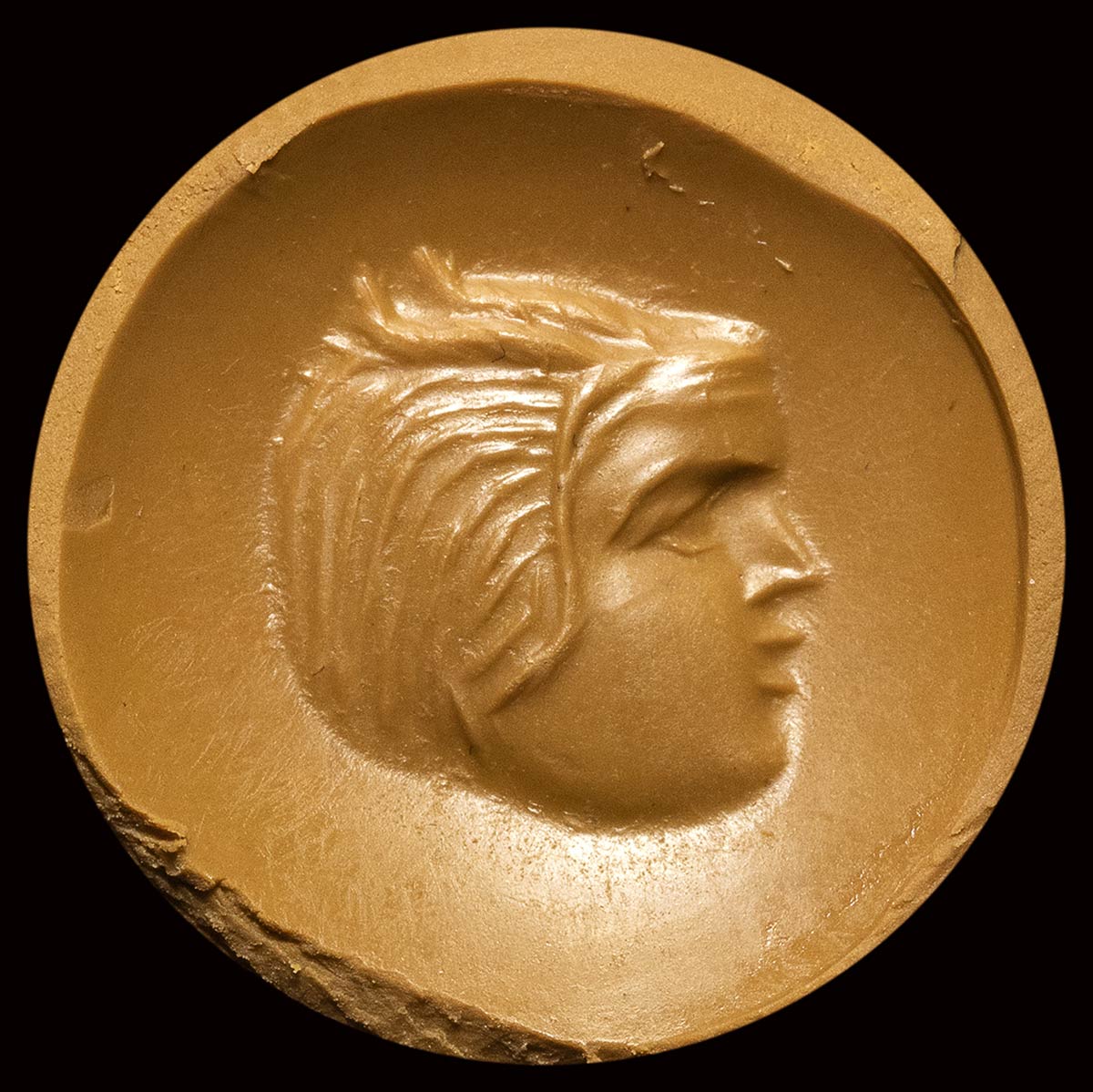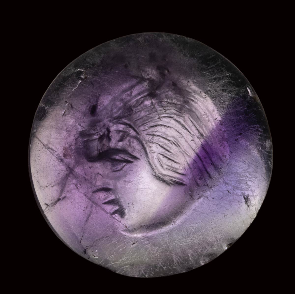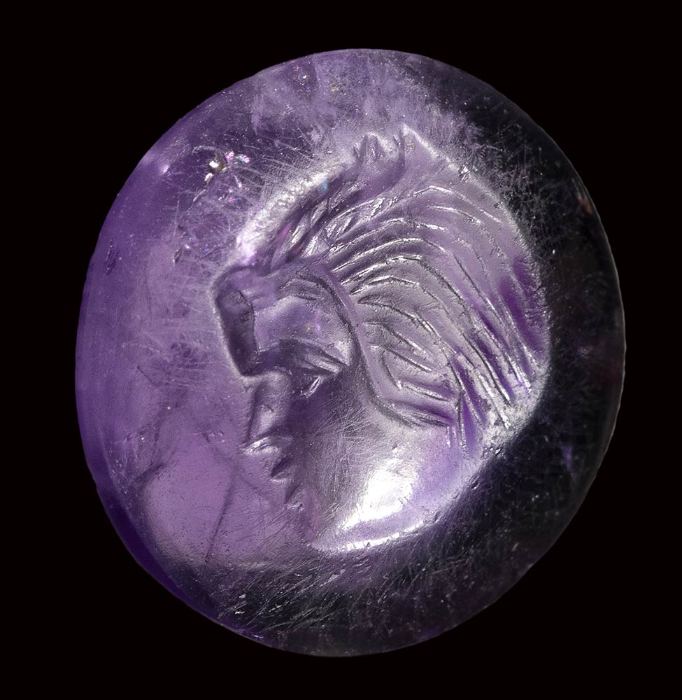 Theatrical mask of a young faun, facing left and placed in the center of the rounded gem. The style, composition and choice of stone refer to the late Republican production. Attractive intense purple color. Slight wear marks.