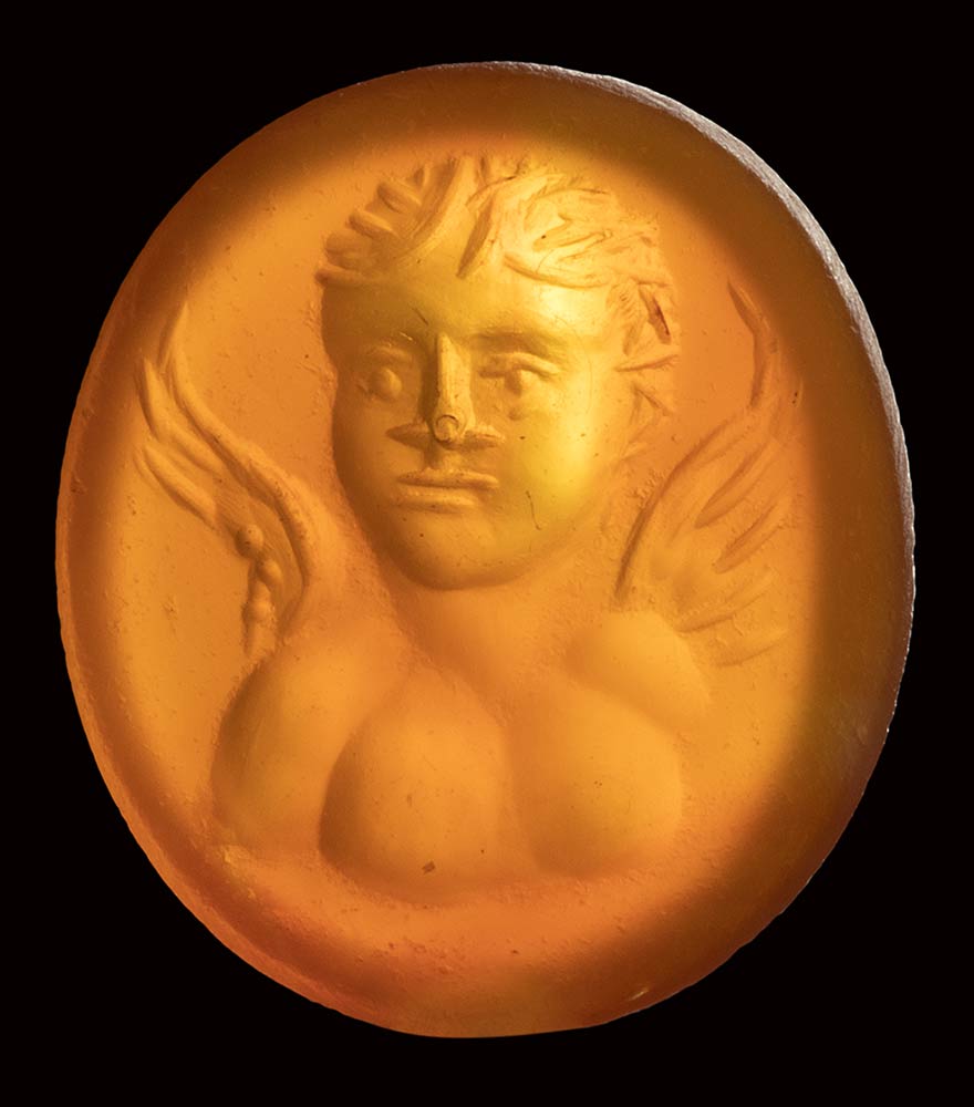 The young winged Eros is depicted frontally, with a very light torsion of the bust to the right and of the head to the left. Very fine execution. Use of globular elements (late republican style). Beautiful color of the stone. Slight wear marks.