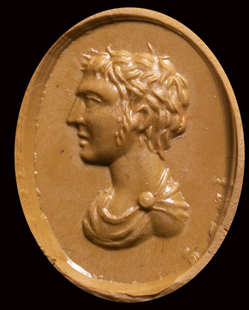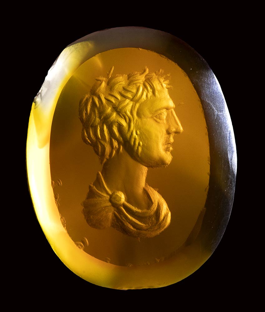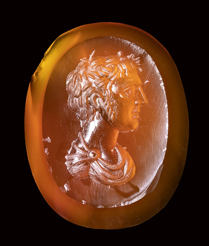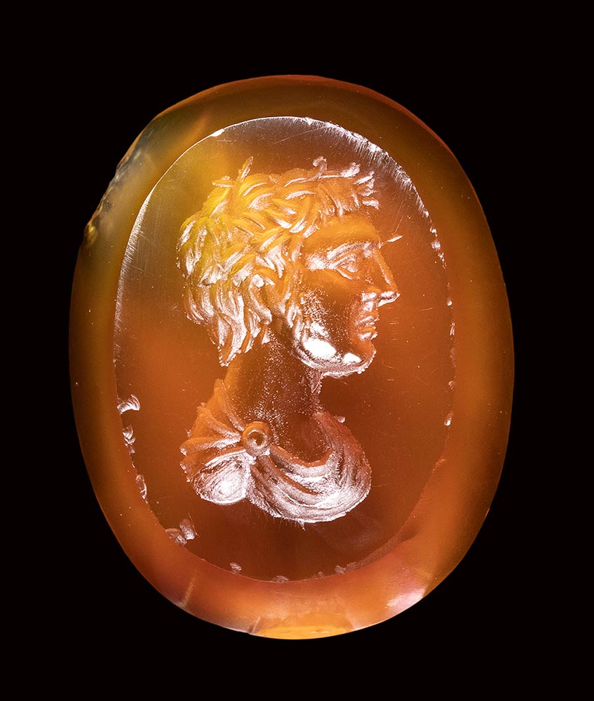 A fine roman carnelian intaglio. Male bust.<br><br>1st - 2nd century A.D.