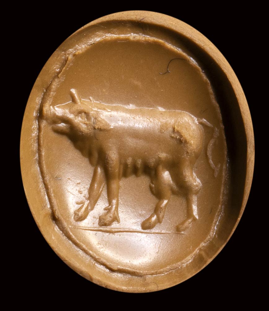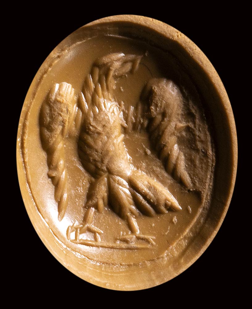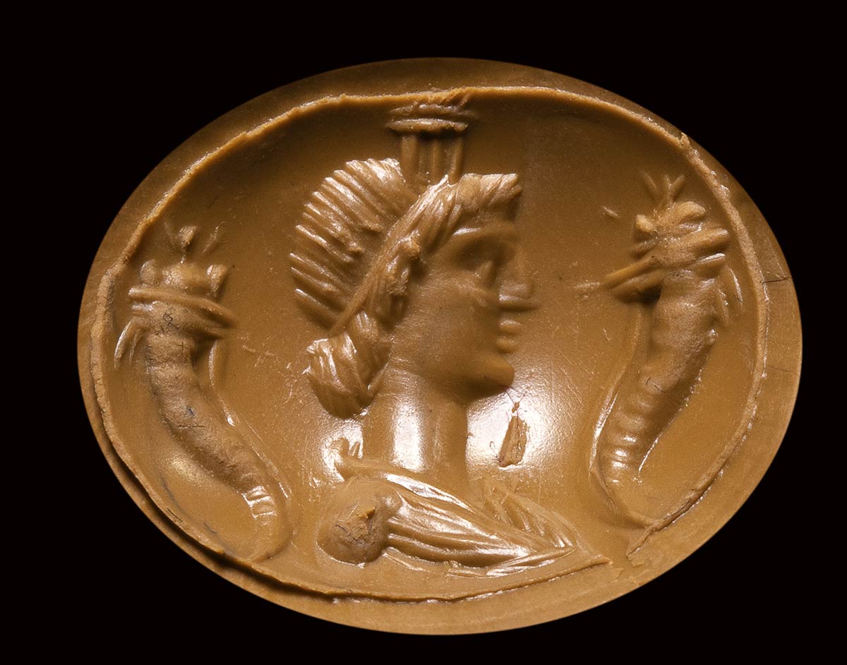 Large hollowed hoop expending at the shoulders, on each side above two round raised settings containing amethyst intaglios. In the center, a larger oval raised setting containing a large amethyst intaglio. Intaglios depict respectively; an eagle with wide-spreaded wings, a bust of a Tyche of Antioch facing left and framed by two cornucopiae; a sow facing right. Wear marks and deposits. Rare tipology.