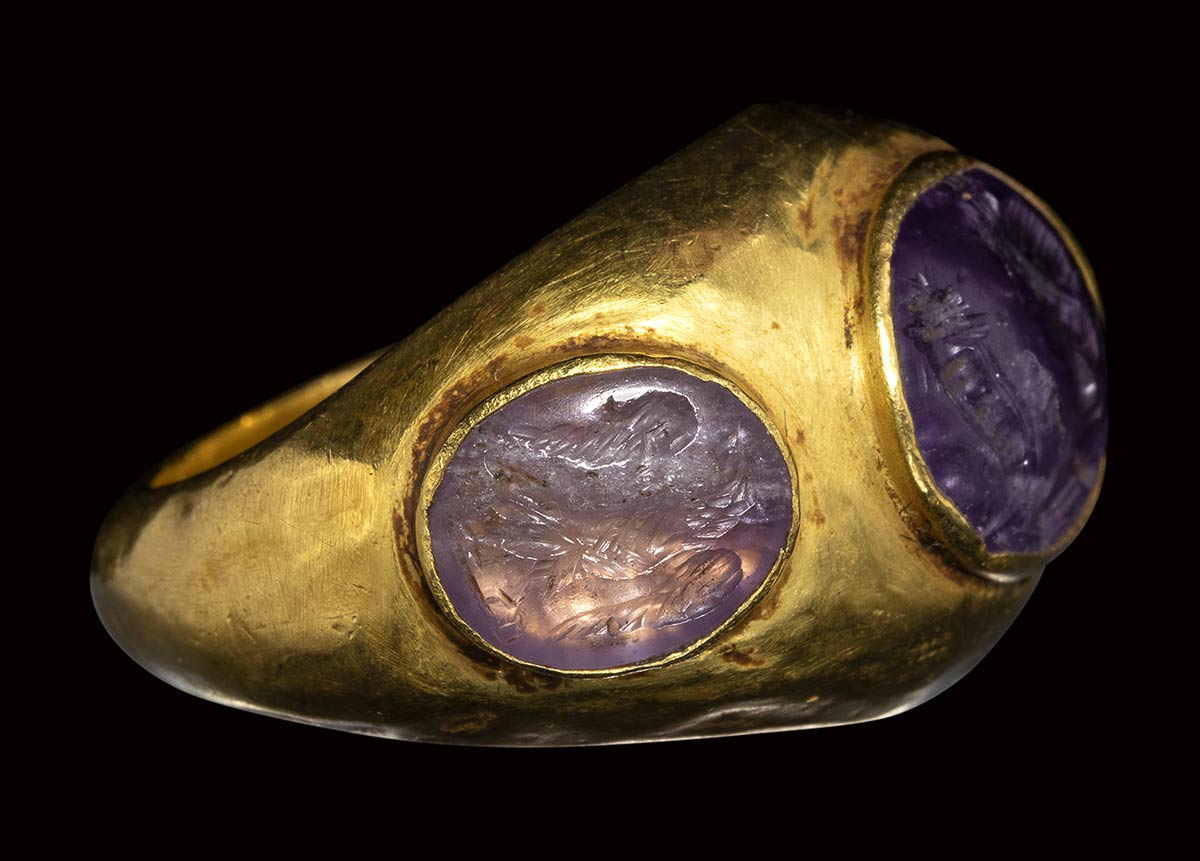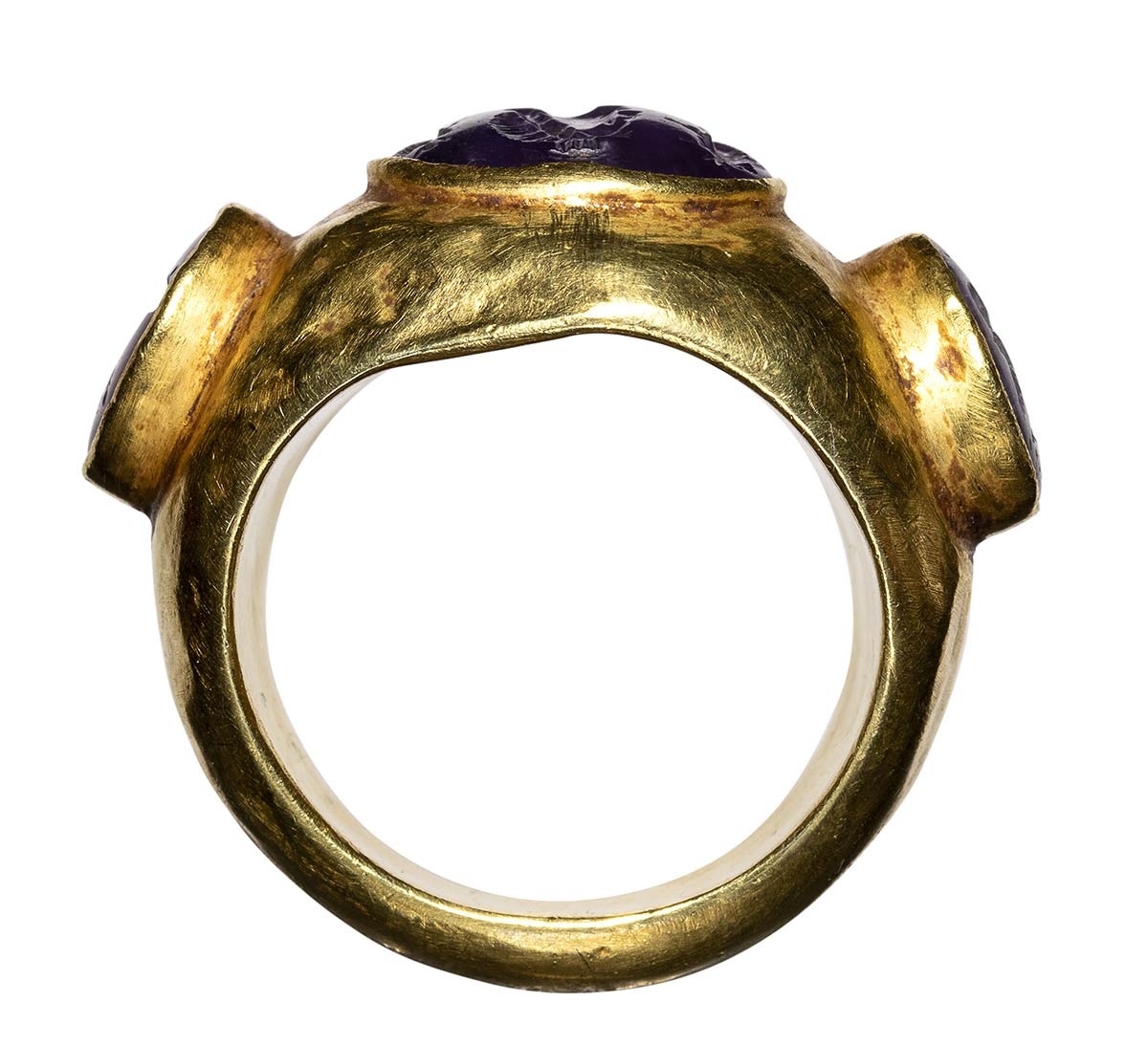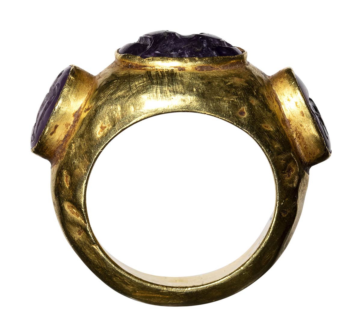 A large roman gold ring set with three amethyst intaglios. Eagle, Tyche of Antioch bust with cornucopiae and a sow.