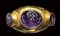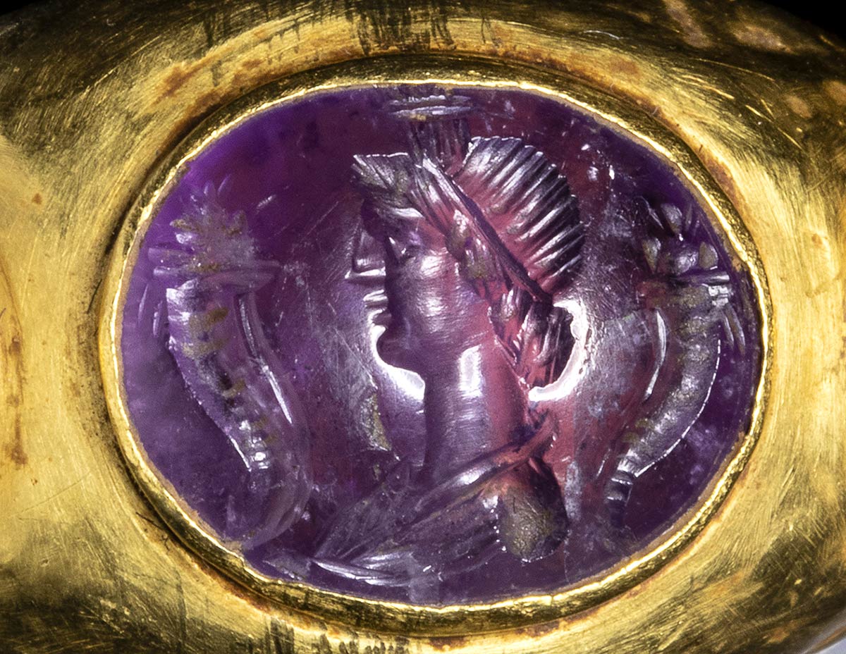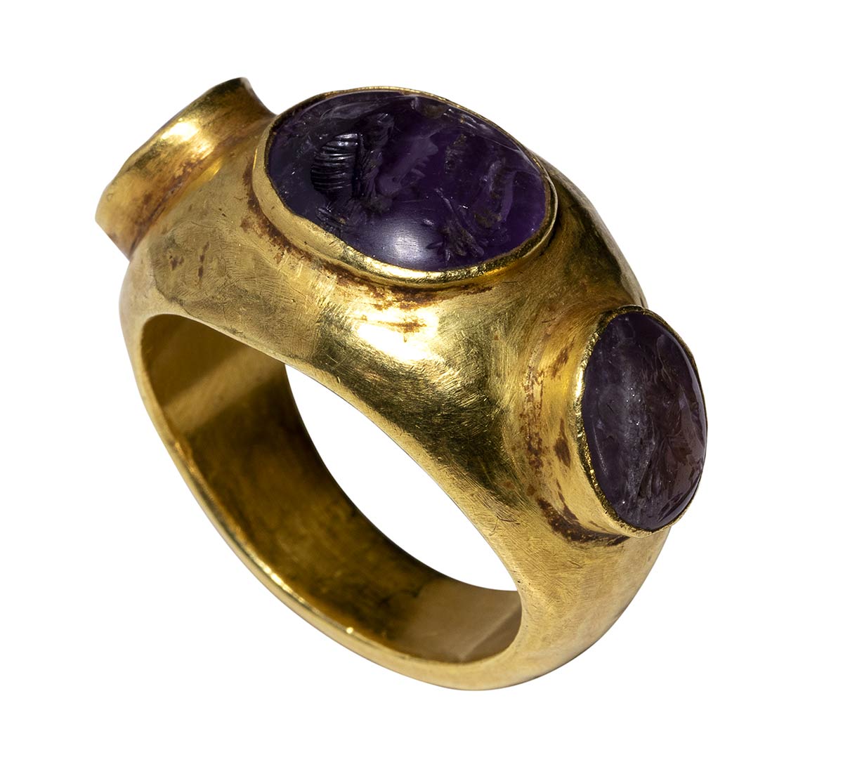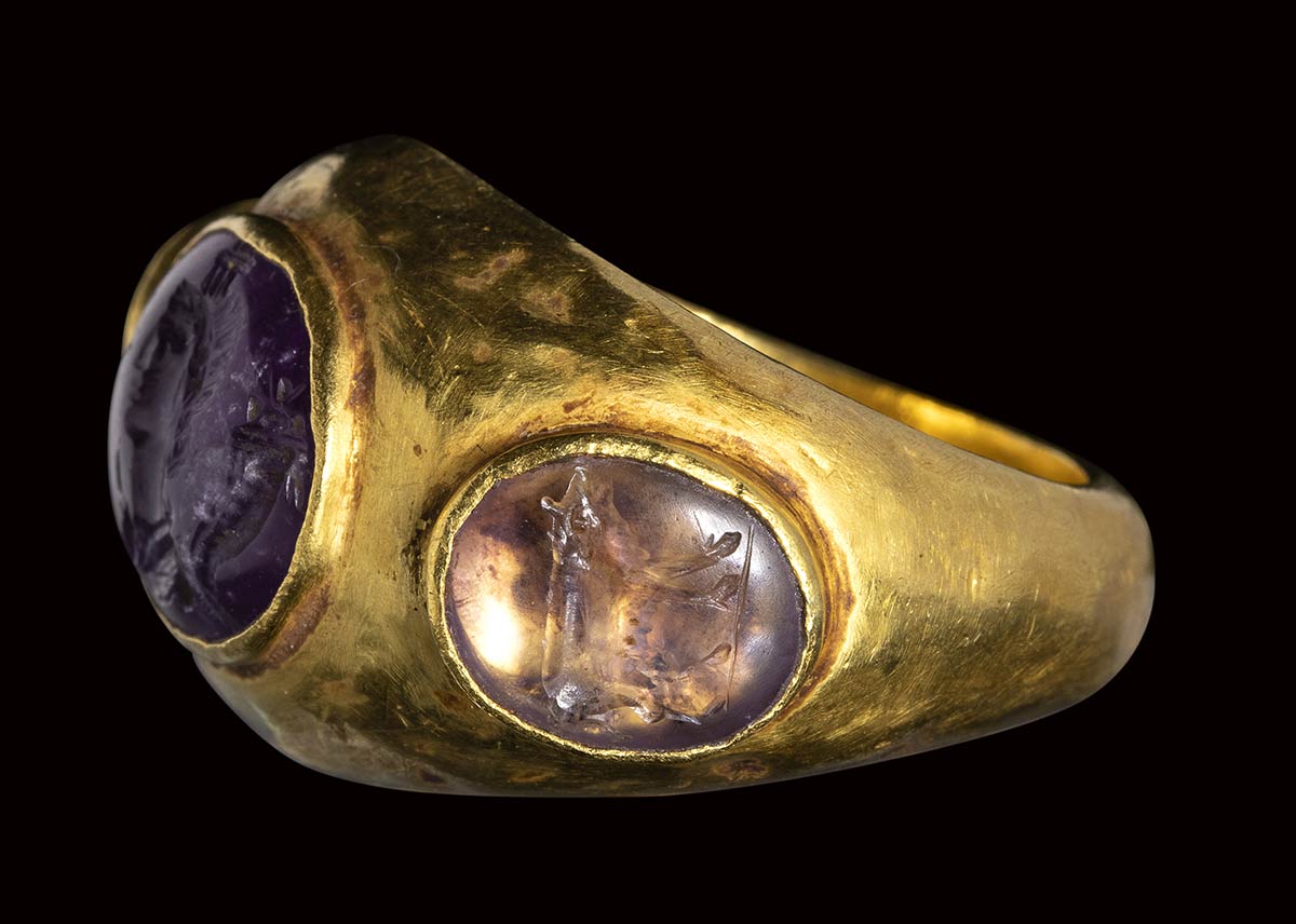 A large roman gold ring set with three amethyst intaglios. Eagle, Tyche of Antioch bust with cornucopiae and a sow.