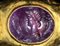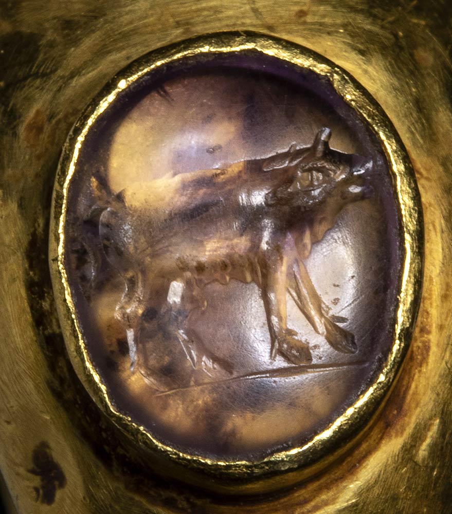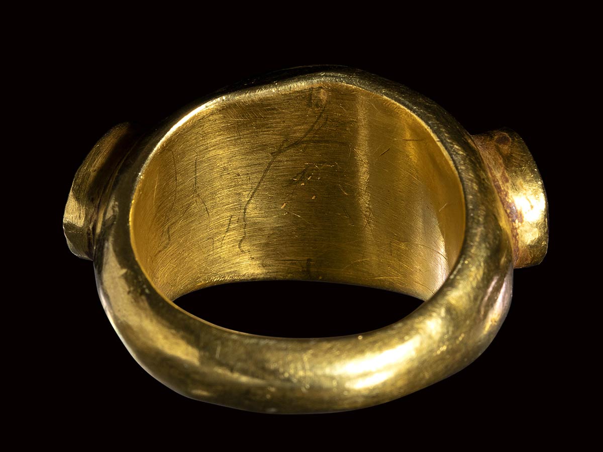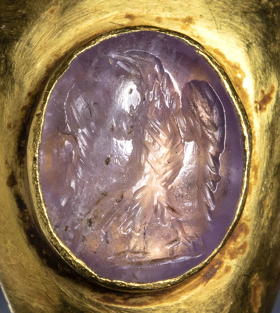 A large roman gold ring set with three amethyst intaglios. Eagle, Male portrait with cornucopia and a sow. 3rd century A.D.