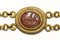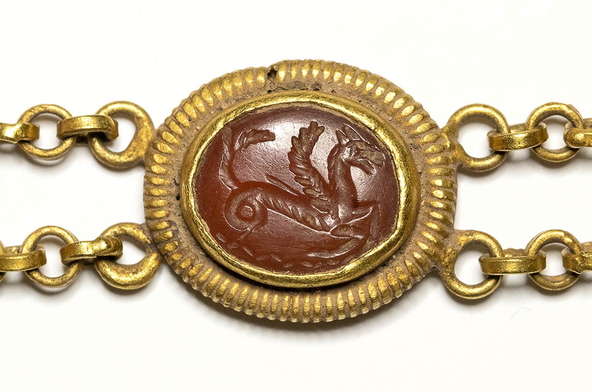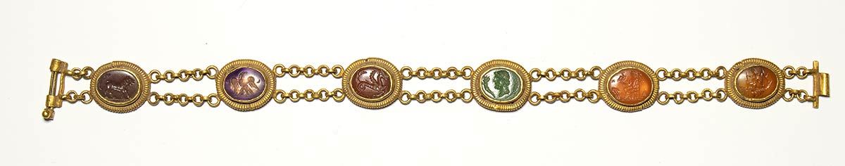 From right to left: agate intaglio with male figure catching a big fish with a trident; carnelian intaglio with seated Zeus holding eagle, with attributes; green chalcedony intaglio with male head between a cornucopia and ear of wheat; carnelian intaglio with a sea monster; amethyst intaglio with eagle between star and crescent moon; agate intaglio with a lion. The gems are mounted in an original gold roman bracelet: each stone is surrounded by a frame with four rings, to which two registers of chains are attached, formed by modules of seven links. The closure is by clasp. Wear marks and deposits. Intact, with minor restoration.