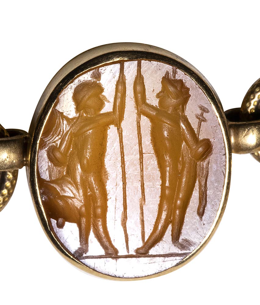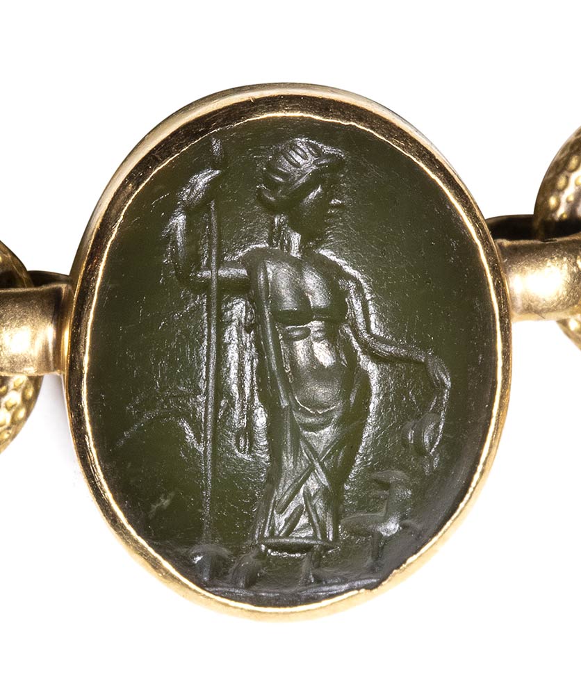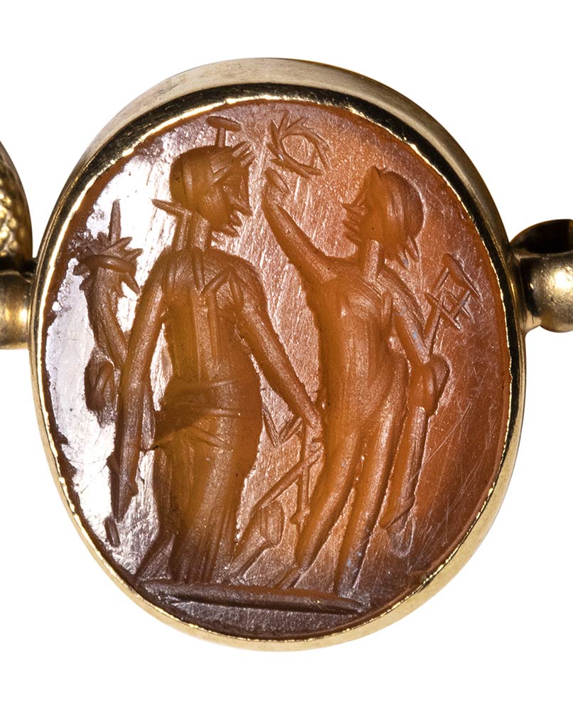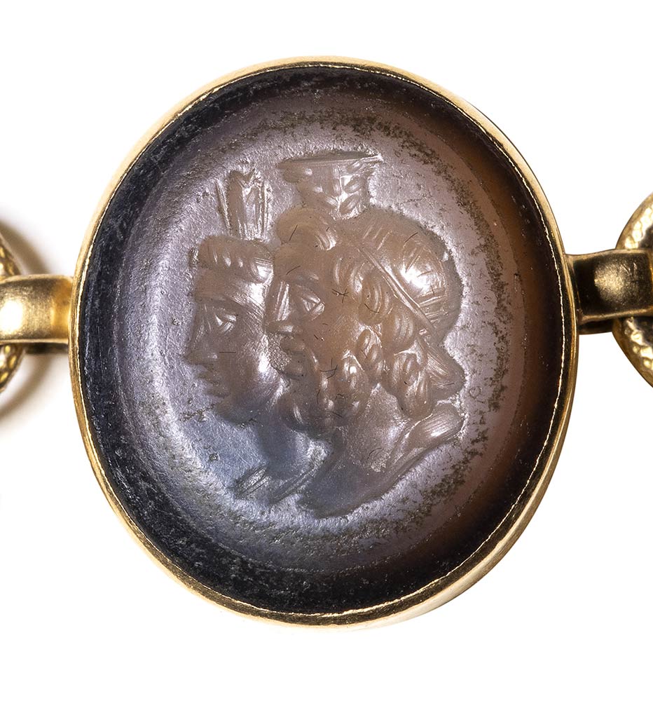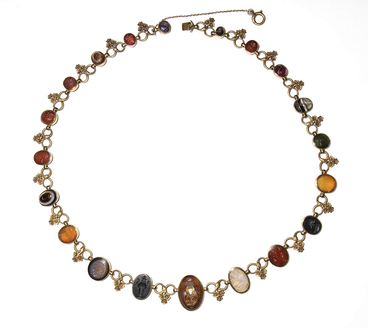 Composed of a long chain with 20 gold snakes, each one intertwined in the infinity-shape with three flowers. Suspension hoop on each side of these holding an oval box-setting set with an intaglio or a cameo. From left to right; amethyst intaglio : eagle and man, carnelian intaglio: crab, three-layered agate intaglio: portrait of Serapis, carnelian intaglio: gryllos, carnelian intaglio Fortuna-Tyche, carnelian intaglio: Athena, three-layered agate intaglio: sea-goat with stars, carnelian intaglio: Fortuna-Tyche encrowned by Mercury, nicolo intaglio: double portrait of Isis and Serapis, eliotrope intaglio: mummiformed Osiris, three-layered cameo: Osiris canopic jar (crown missing), two-layered agate cameo: panther, carnelian intaglio: Victory and armour, bloodstone intaglio: bust of Ceres, carnelian intaglio: Dioscures, green chalcedony intaglio: Bacchus with panther, banded agate intaglio: seated warrior, garnet intaglio: griffin, carnelian intaglio: crouched dog, three-layered agate intaglio: head of boy. The mounting renaissance style set with these roman stones reminds the work of Louis Wiese (1852-1923) son of the famous jeweller Jules Wiese, well-known for his ornamental repertoire of the Middle Ages and the Renaissance. WIESE’s jewelry has a strong sculptural character always inspired from original ancient models. Very fine condition.