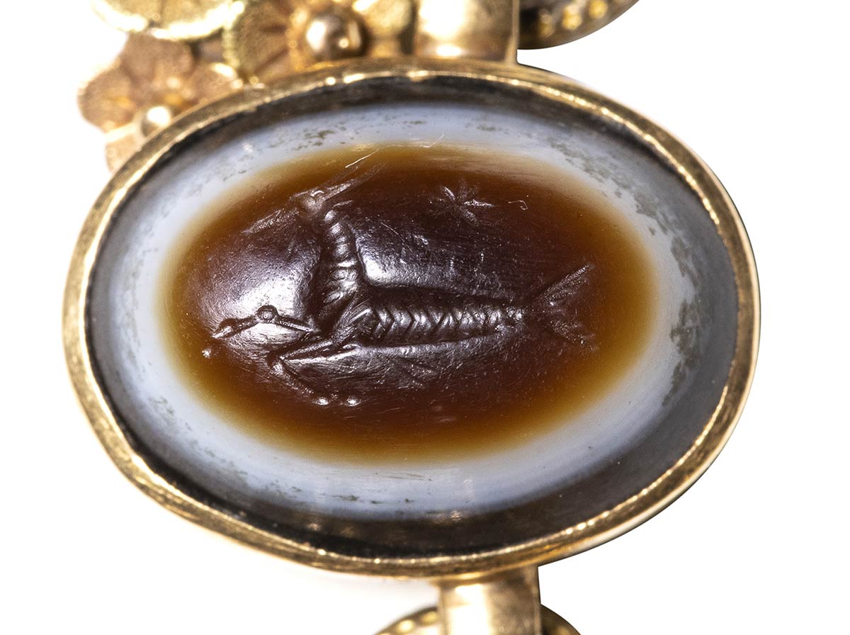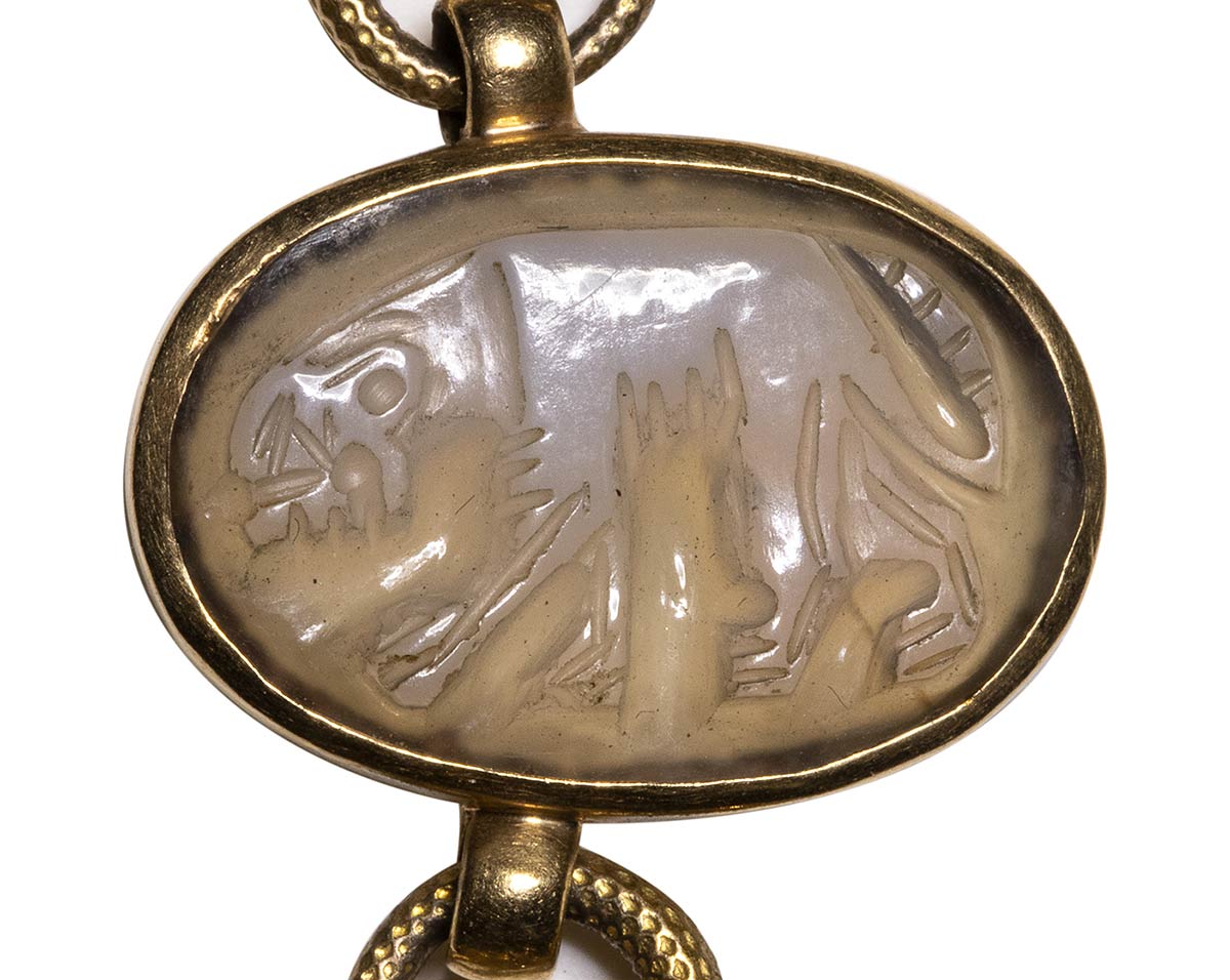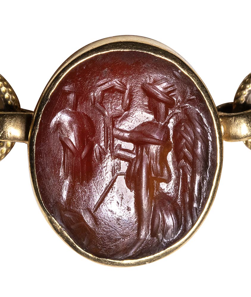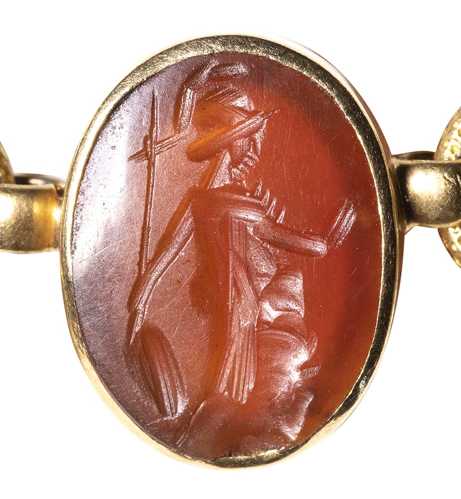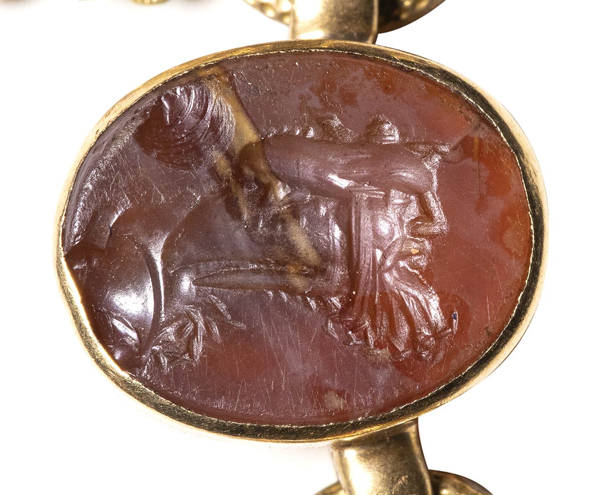 Composed of a long chain with 20 gold snakes, each one intertwined in the infinity-shape with three flowers. Suspension hoop on each side of these holding an oval box-setting set with an intaglio or a cameo. From left to right; amethyst intaglio : eagle and man, carnelian intaglio: crab, three-layered agate intaglio: portrait of Serapis, carnelian intaglio: gryllos, carnelian intaglio Fortuna-Tyche, carnelian intaglio: Athena, three-layered agate intaglio: sea-goat with stars, carnelian intaglio: Fortuna-Tyche encrowned by Mercury, nicolo intaglio: double portrait of Isis and Serapis, eliotrope intaglio: mummiformed Osiris, three-layered cameo: Osiris canopic jar (crown missing), two-layered agate cameo: panther, carnelian intaglio: Victory and armour, bloodstone intaglio: bust of Ceres, carnelian intaglio: Dioscures, green chalcedony intaglio: Bacchus with panther, banded agate intaglio: seated warrior, garnet intaglio: griffin, carnelian intaglio: crouched dog, three-layered agate intaglio: head of boy. The mounting renaissance style set with these roman stones reminds the work of Louis Wiese (1852-1923) son of the famous jeweller Jules Wiese, well-known for his ornamental repertoire of the Middle Ages and the Renaissance. WIESE’s jewelry has a strong sculptural character always inspired from original ancient models. Very fine condition.