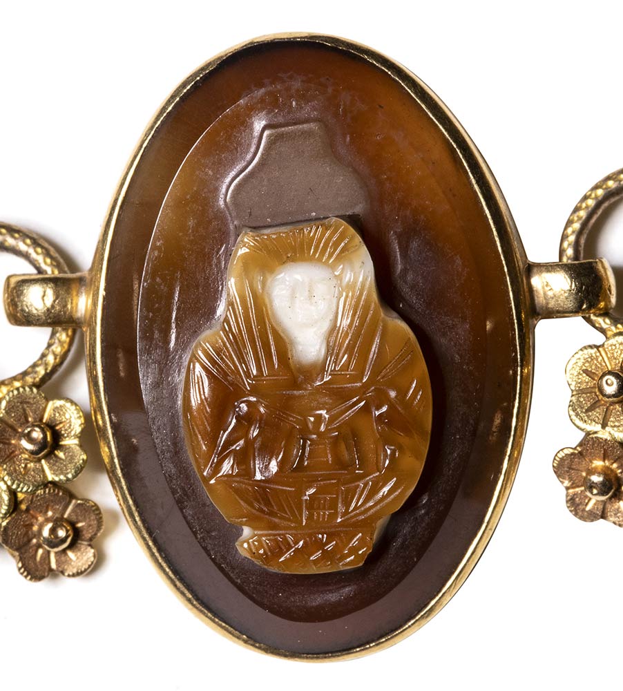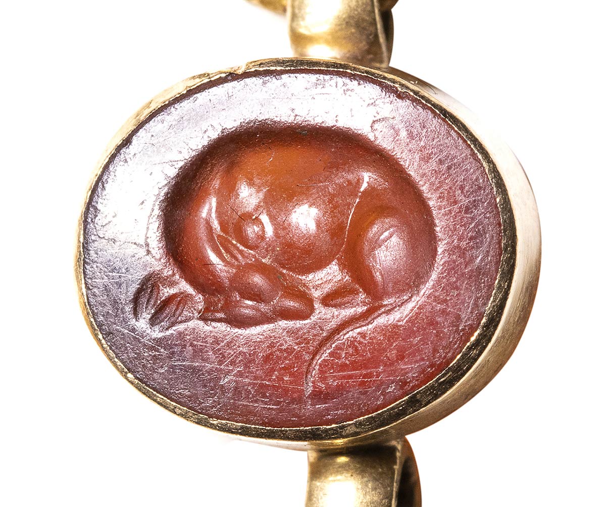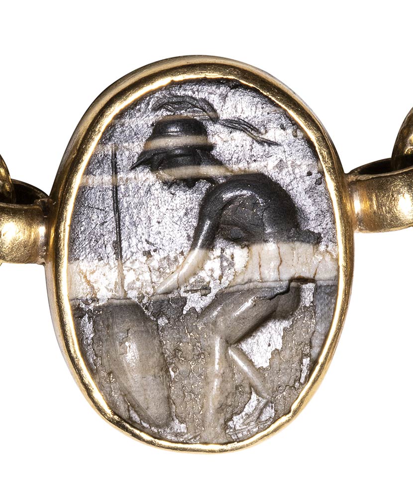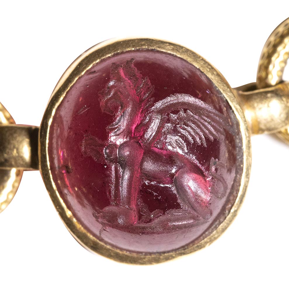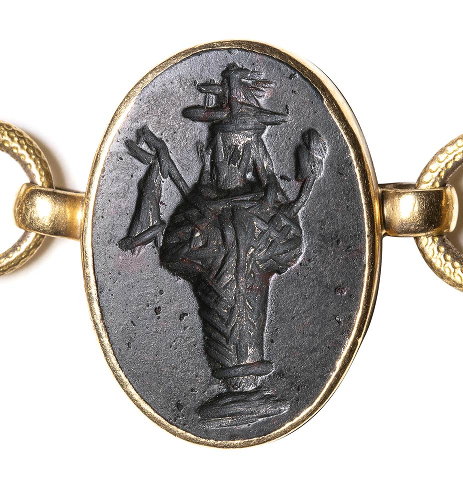 Composed of a long chain with 20 gold snakes, each one intertwined in the infinity-shape with three flowers. Suspension hoop on each side of these holding an oval box-setting set with an intaglio or a cameo. From left to right; amethyst intaglio : eagle and man, carnelian intaglio: crab, three-layered agate intaglio: portrait of Serapis, carnelian intaglio: gryllos, carnelian intaglio Fortuna-Tyche, carnelian intaglio: Athena, three-layered agate intaglio: sea-goat with stars, carnelian intaglio: Fortuna-Tyche encrowned by Mercury, nicolo intaglio: double portrait of Isis and Serapis, eliotrope intaglio: mummiformed Osiris, three-layered cameo: Osiris canopic jar (crown missing), two-layered agate cameo: panther, carnelian intaglio: Victory and armour, bloodstone intaglio: bust of Ceres, carnelian intaglio: Dioscures, green chalcedony intaglio: Bacchus with panther, banded agate intaglio: seated warrior, garnet intaglio: griffin, carnelian intaglio: crouched dog, three-layered agate intaglio: head of boy. The mounting renaissance style set with these roman stones reminds the work of Louis Wiese (1852-1923) son of the famous jeweller Jules Wiese, well-known for his ornamental repertoire of the Middle Ages and the Renaissance. WIESE’s jewelry has a strong sculptural character always inspired from original ancient models. Very fine condition.