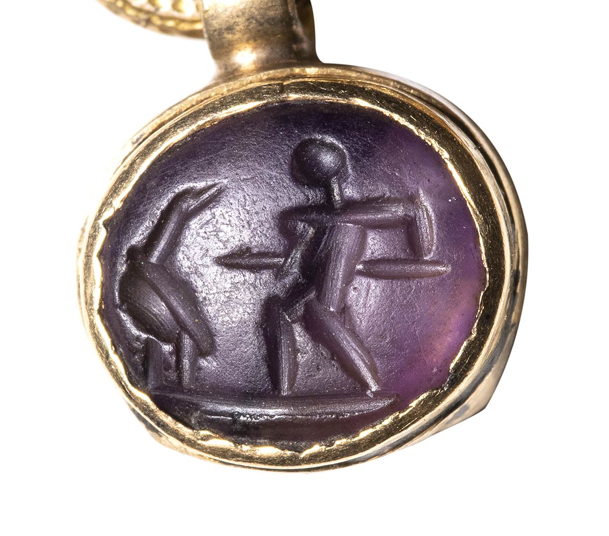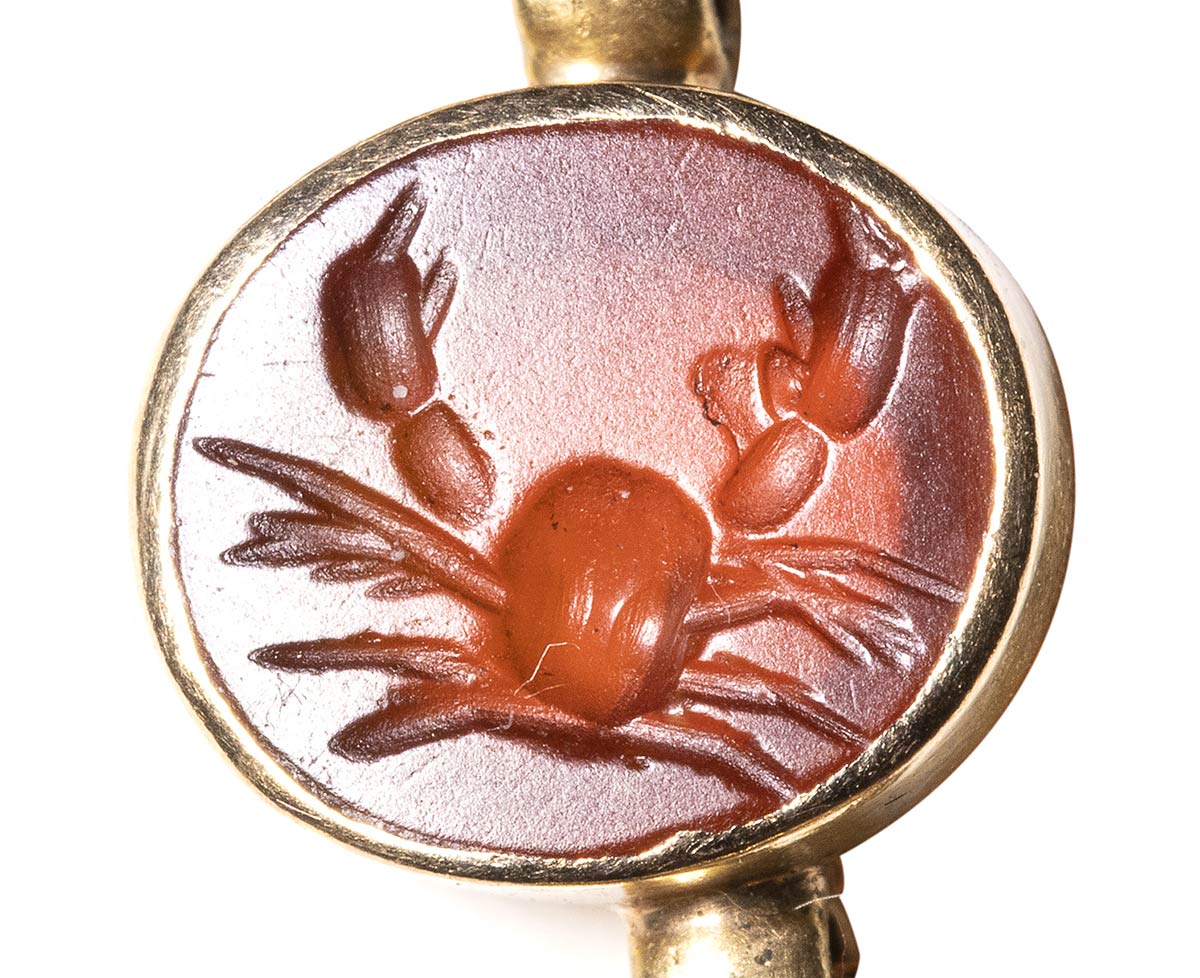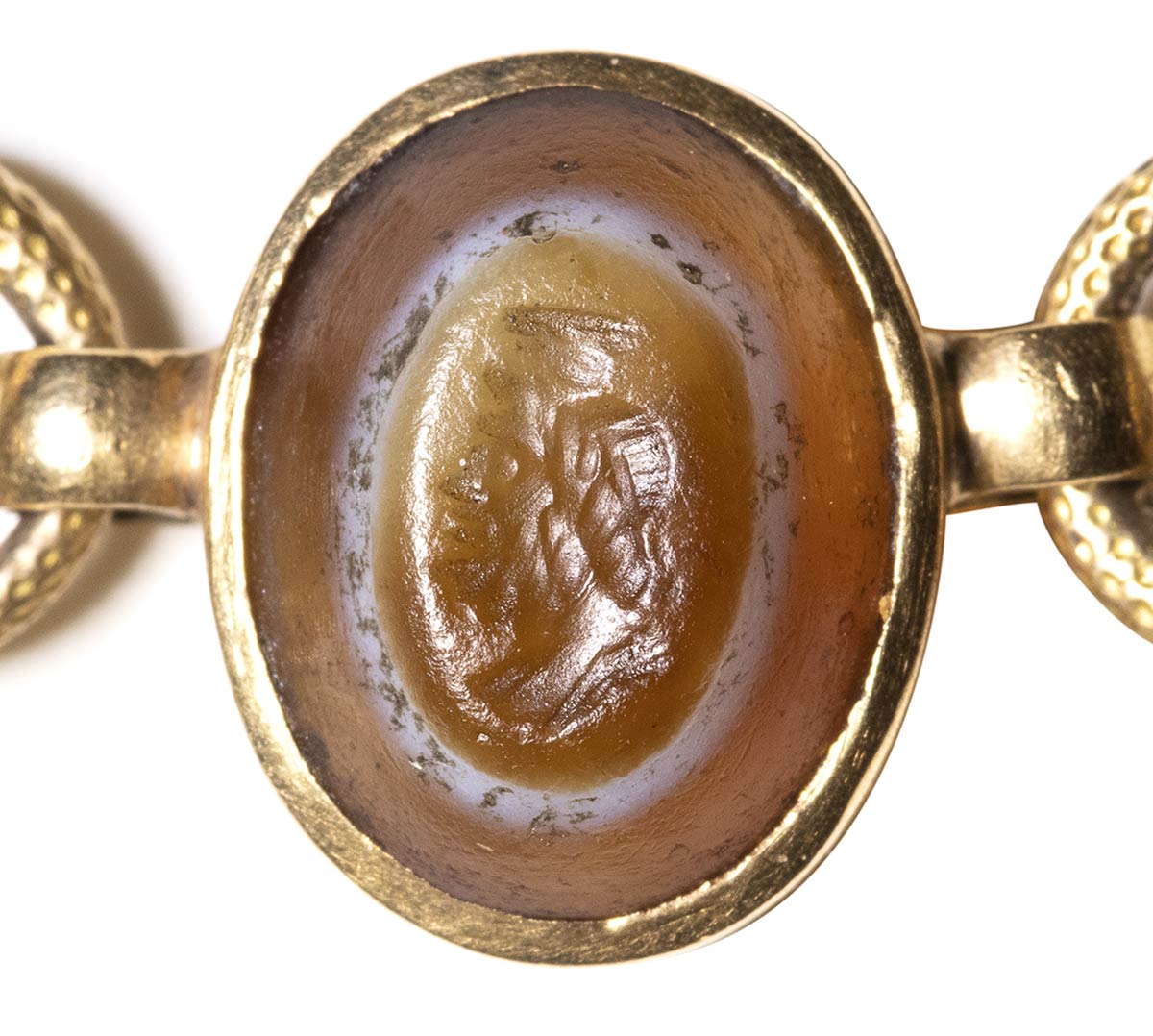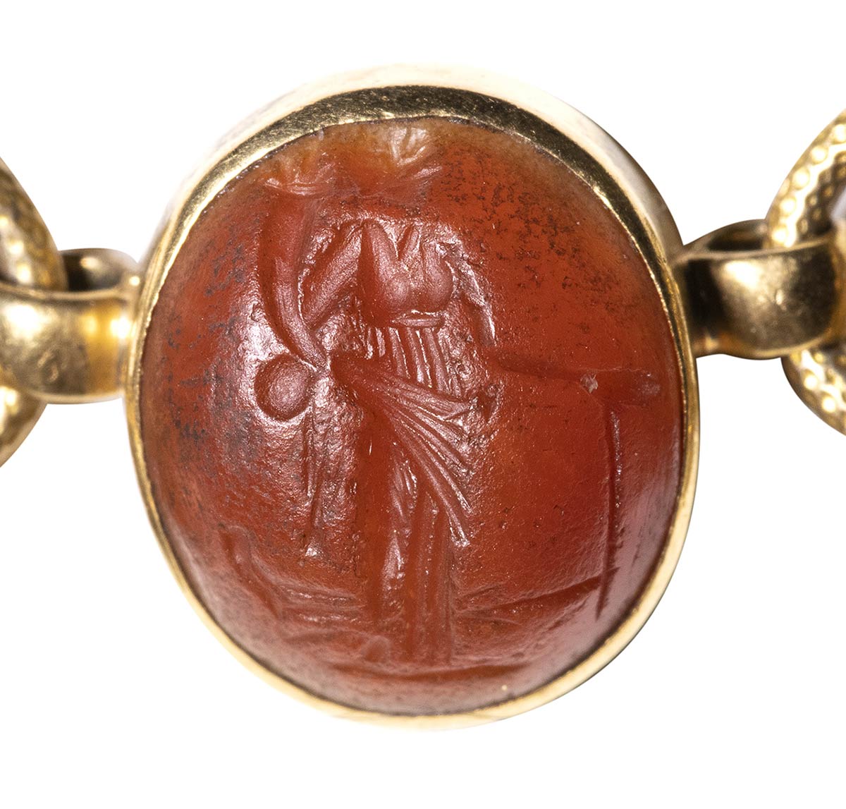 Composed of a long chain with 20 gold snakes, each one intertwined in the infinity-shape with three flowers. Suspension hoop on each side of these holding an oval box-setting set with an intaglio or a cameo. From left to right; amethyst intaglio : eagle and man, carnelian intaglio: crab, three-layered agate intaglio: portrait of Serapis, carnelian intaglio: gryllos, carnelian intaglio Fortuna-Tyche, carnelian intaglio: Athena, three-layered agate intaglio: sea-goat with stars, carnelian intaglio: Fortuna-Tyche encrowned by Mercury, nicolo intaglio: double portrait of Isis and Serapis, eliotrope intaglio: mummiformed Osiris, three-layered cameo: Osiris canopic jar (crown missing), two-layered agate cameo: panther, carnelian intaglio: Victory and armour, bloodstone intaglio: bust of Ceres, carnelian intaglio: Dioscures, green chalcedony intaglio: Bacchus with panther, banded agate intaglio: seated warrior, garnet intaglio: griffin, carnelian intaglio: crouched dog, three-layered agate intaglio: head of boy. The mounting renaissance style set with these roman stones reminds the work of Louis Wiese (1852-1923) son of the famous jeweller Jules Wiese, well-known for his ornamental repertoire of the Middle Ages and the Renaissance. WIESE’s jewelry has a strong sculptural character always inspired from original ancient models. Very fine condition.