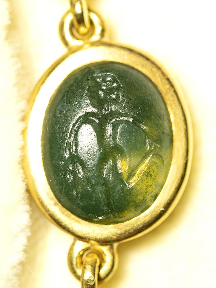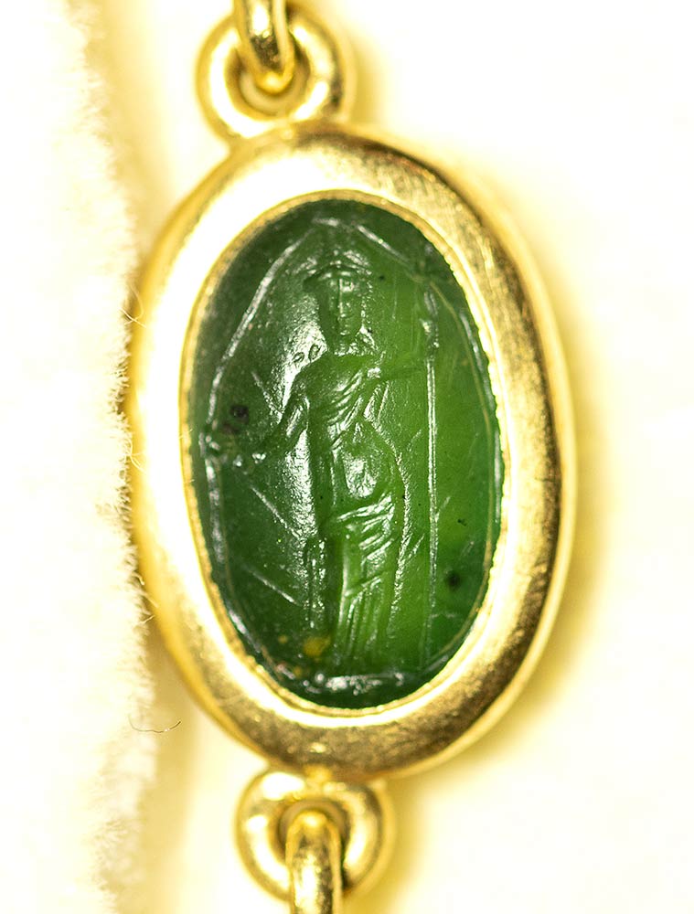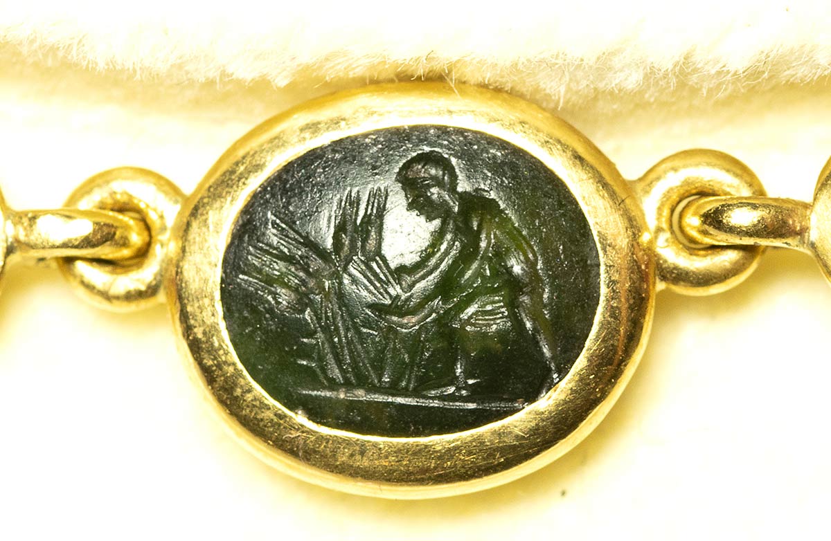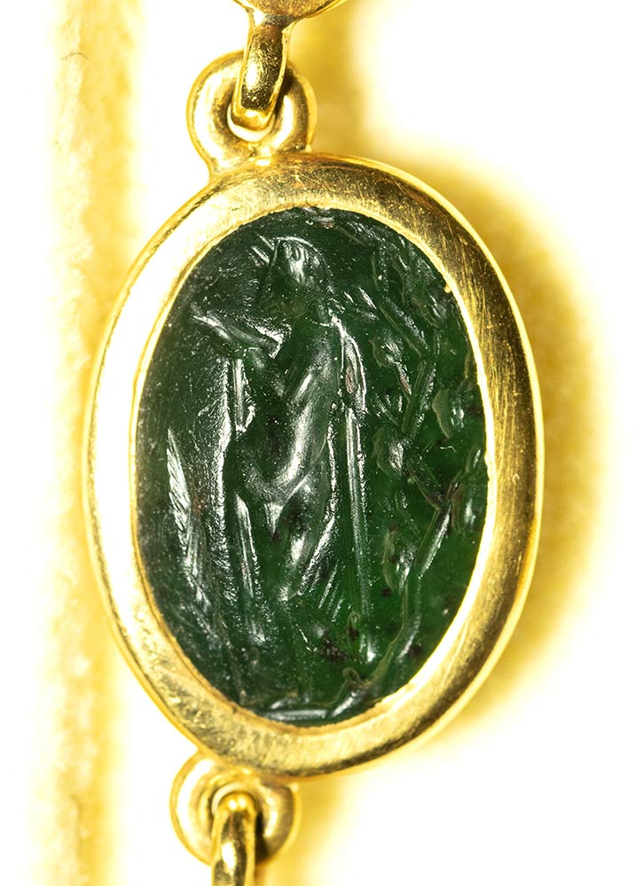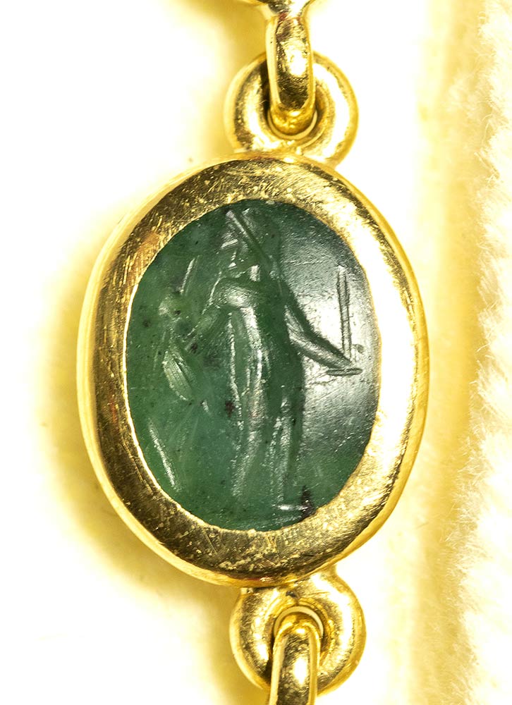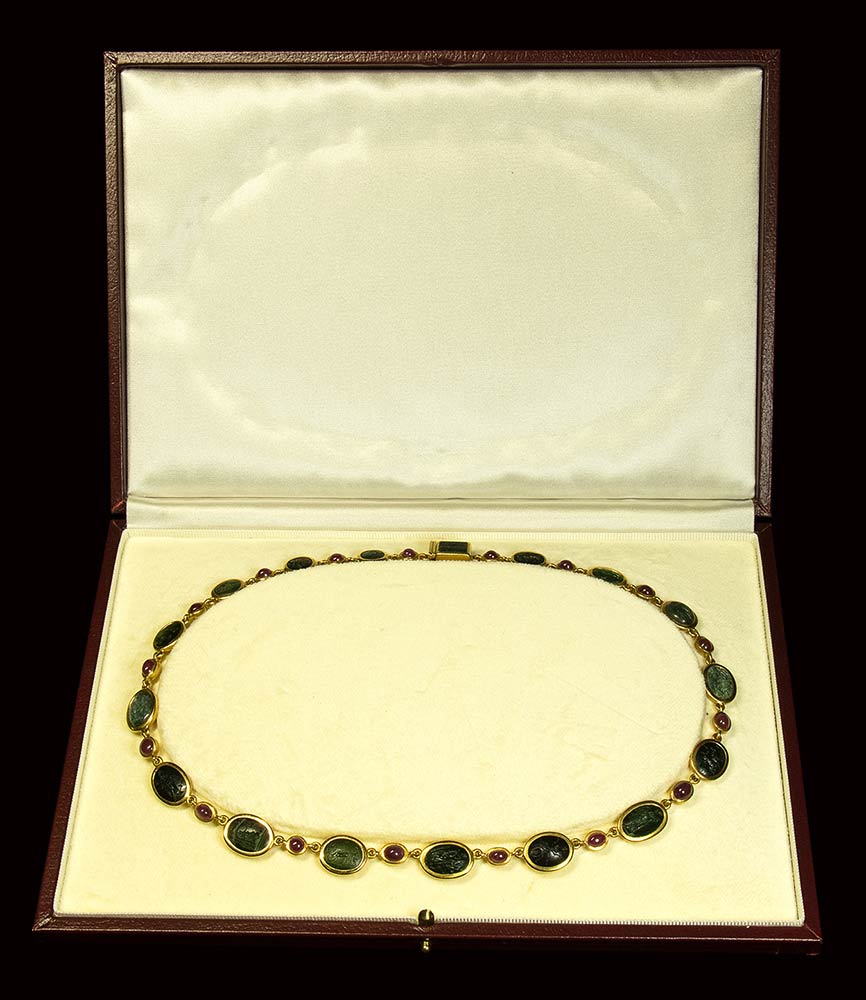 A fine gold necklace with 17 roman green chalcedony intaglios and rubies. Various subjects. Stones: 2nd-3rd century A.D.