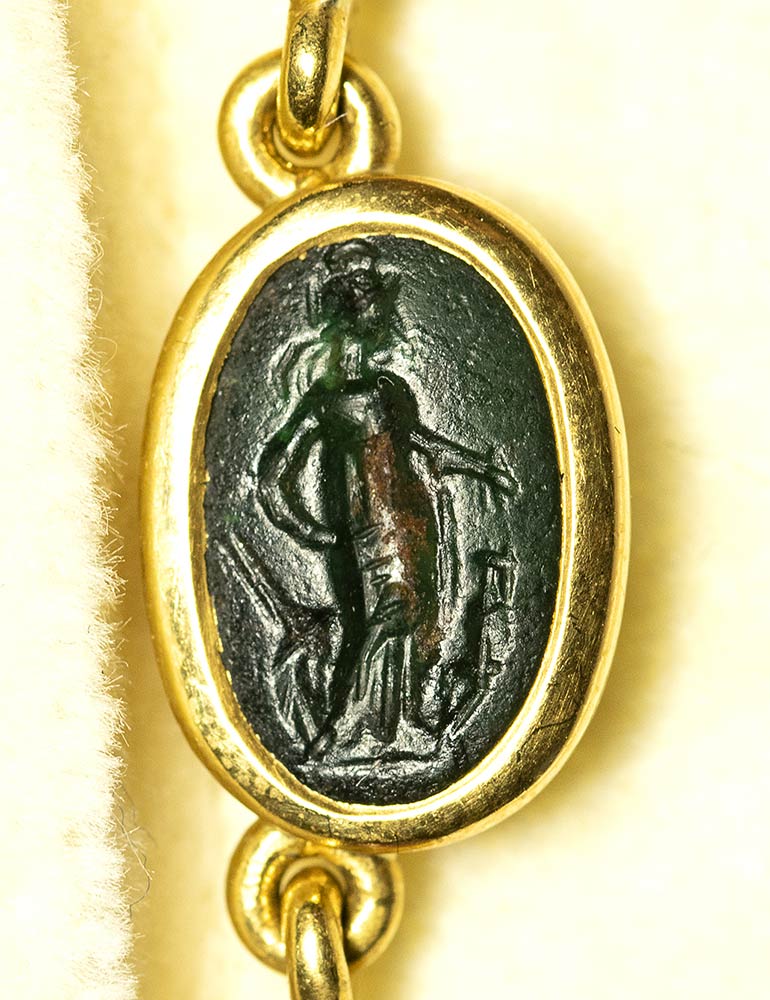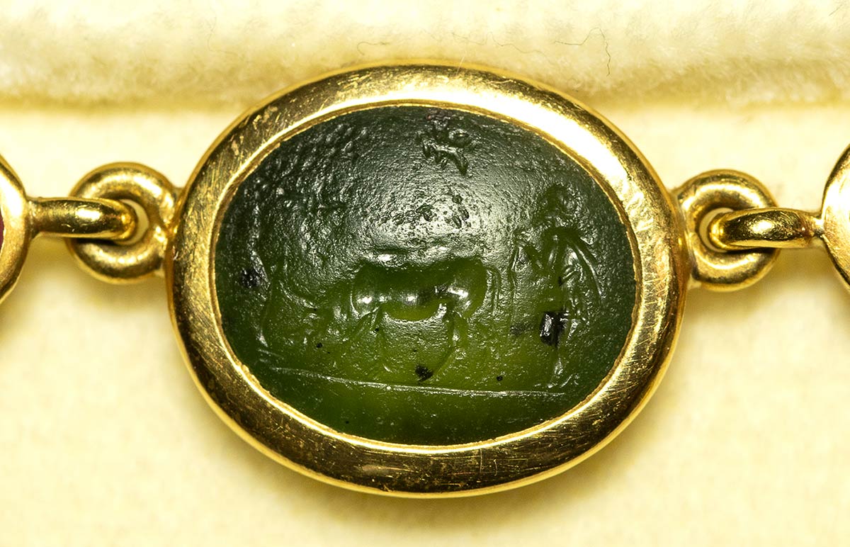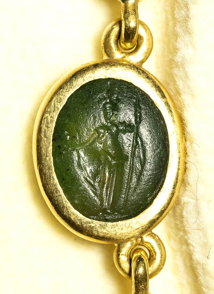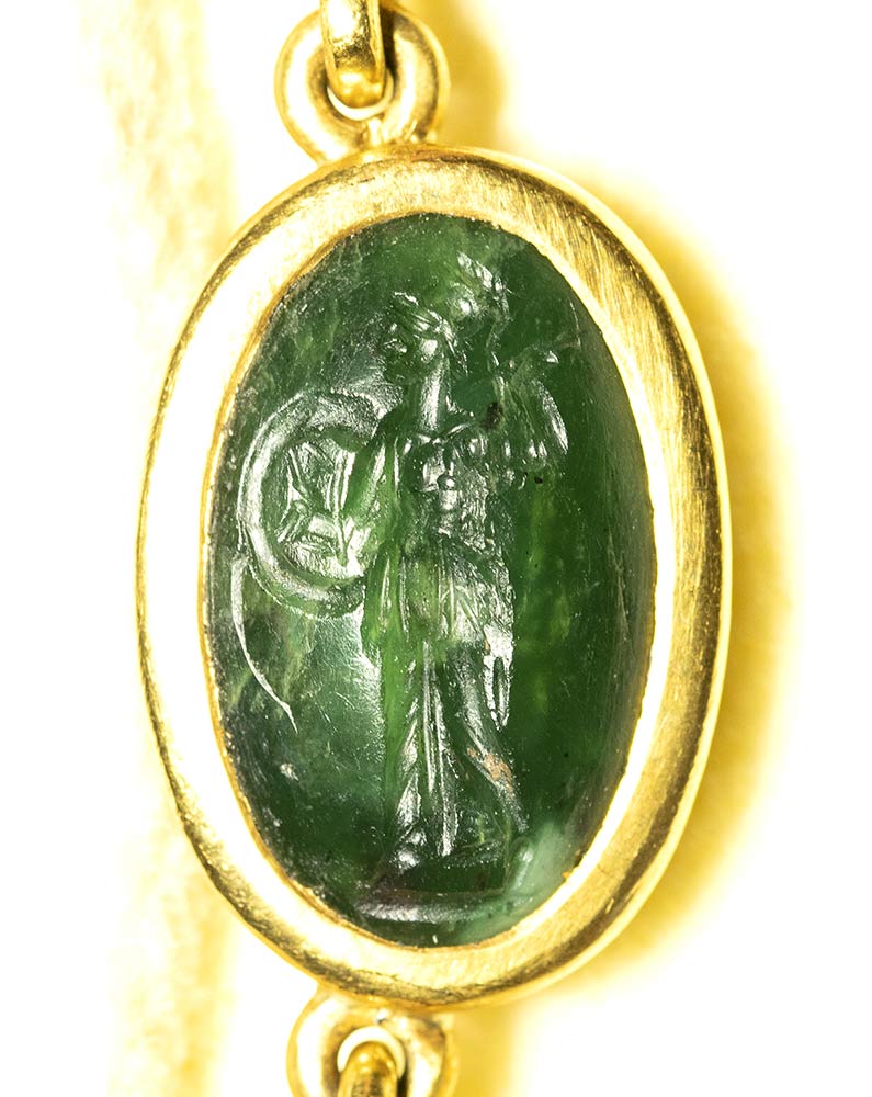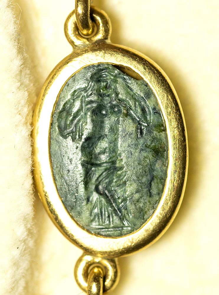 A fine gold necklace with 17 roman green chalcedony intaglios and rubies. Various subjects. Stones: 2nd-3rd century A.D.