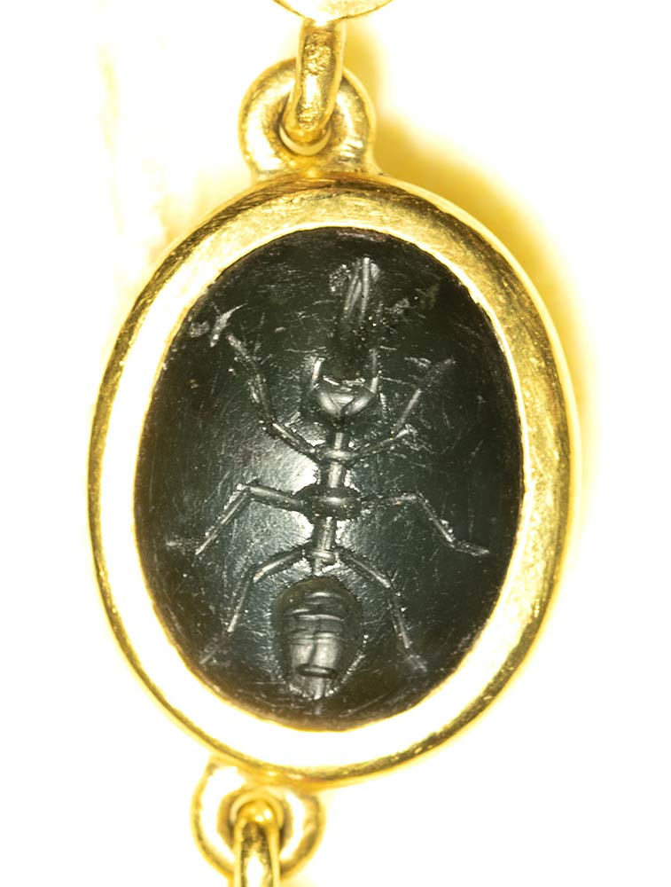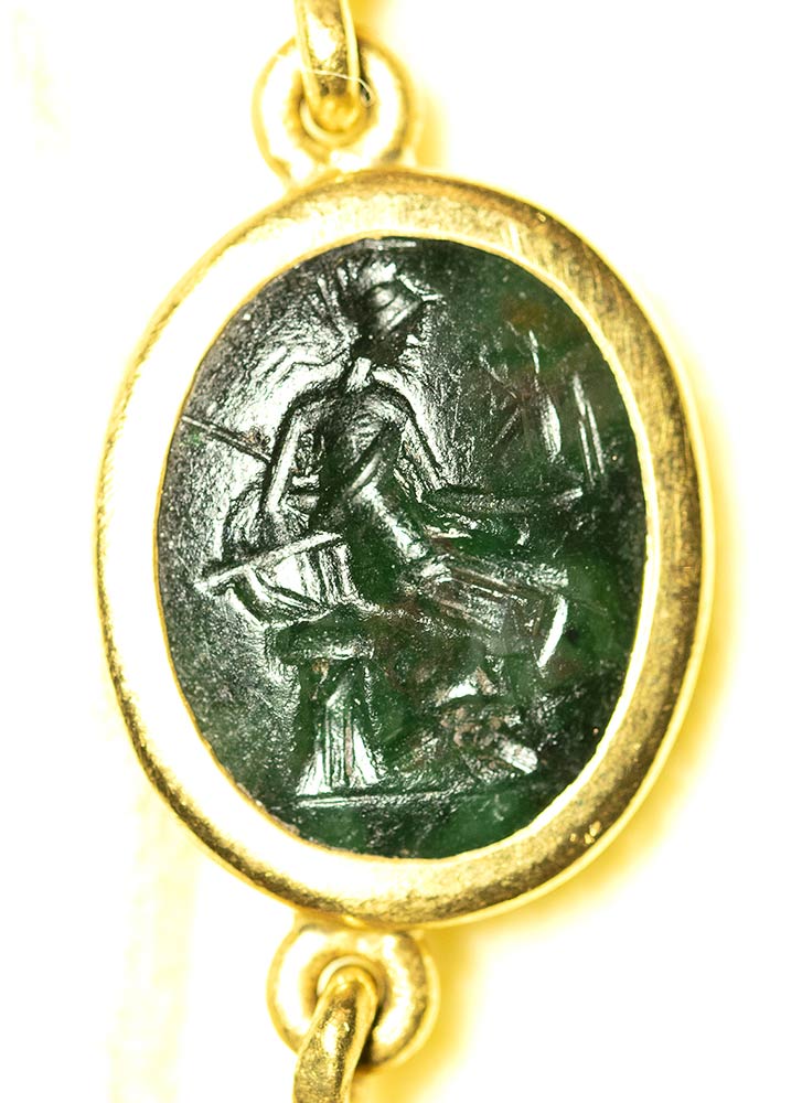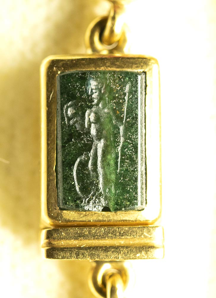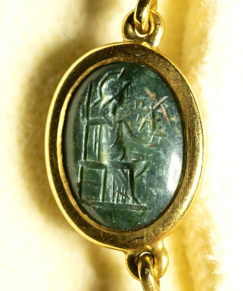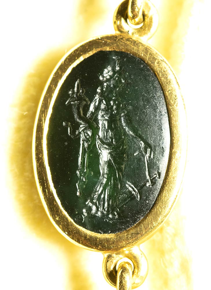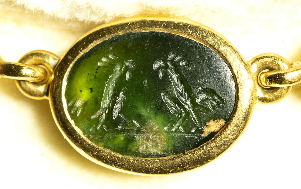 A fine gold necklace with 17 roman green chalcedony intaglios and rubies. Various subjects. Stones: 2nd-3rd century A.D.