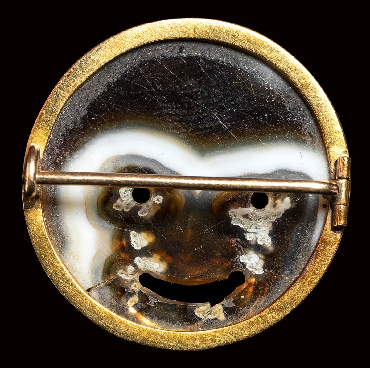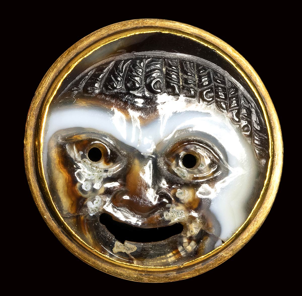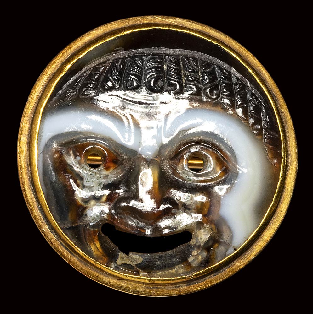 Comic frontal mask of a male character, characterized by braided hair, large eyes (hole passing through the pupils) and large mouth in a smiling grimace (through opening). Mirror polishing. On the back there are some natural micro holes/inclusions due to the natural conformation of the mineral (Sardonyx - Murrina). This kind of stone was used by the best gem engravers to create the most refined and precious works of Art during the Late Hellenistic and the Imperial Roman period. The cameo is mounted in a 19th century brooch with a thin rounded frame. Rare. For the Murrina examples, see D. Del Bufalo, Murrina Vasa. A luxury of Imperial Rome, 2016.