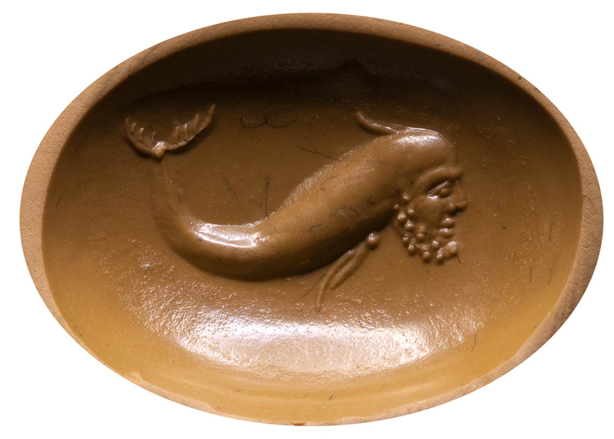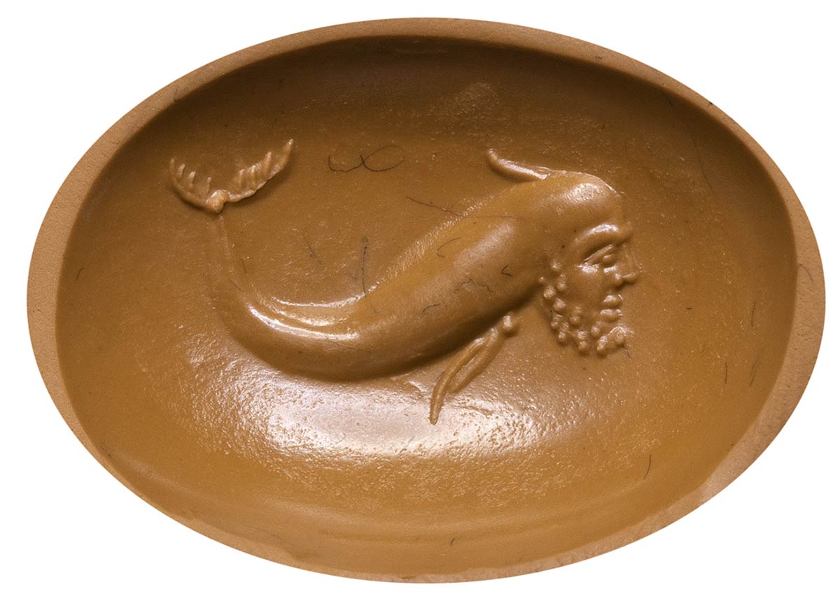 This unusual intaglio depicts an hybrid creature with a bearded man head and a dolphin body, facing left. In the Greek and Roman mythology dolphins were considered as divine creatures associated to the gods such as Neptune, Jupiter, Eros. The hybrid character of this one may symbolized a metamorphosis of a god, yet the lack of attributes regarding the male head do not allow a further identification (the face here used is the type of the Silenus, the same for the Gryllos). Use of globular elements for the beard, fin and tail of the creature. Nice mirror polishing for the engraving and wear marks.