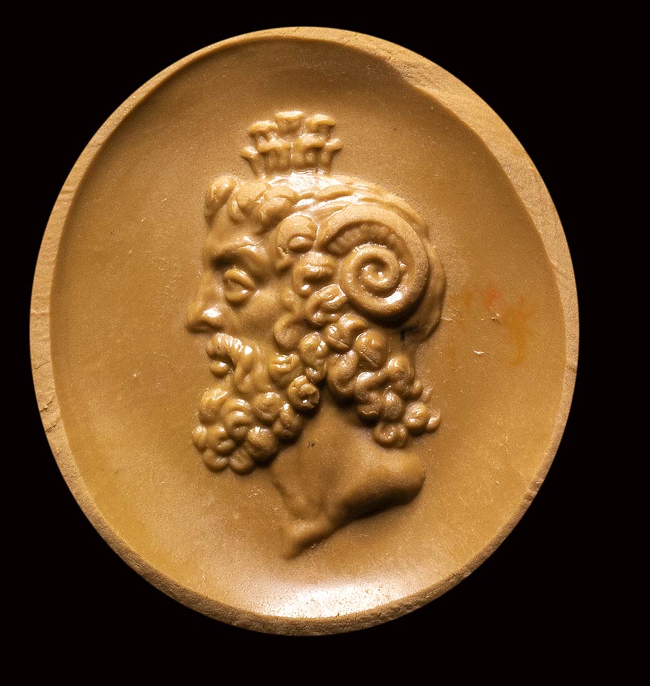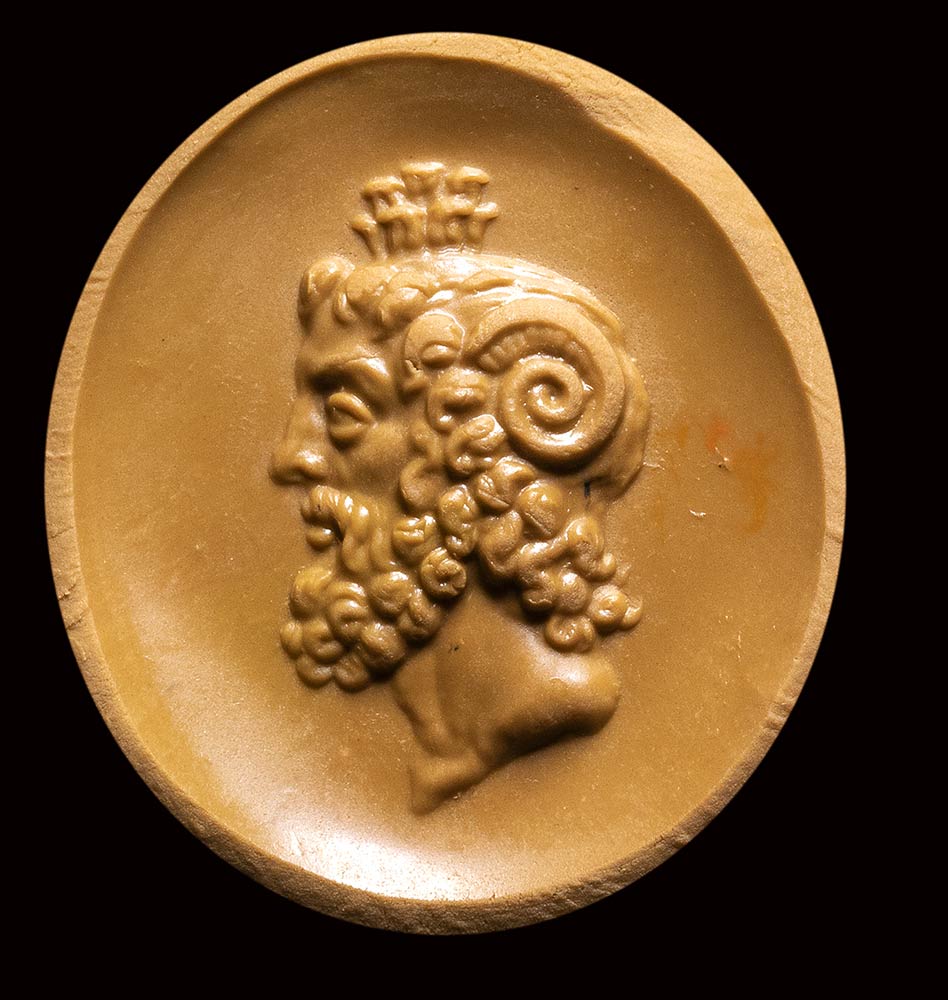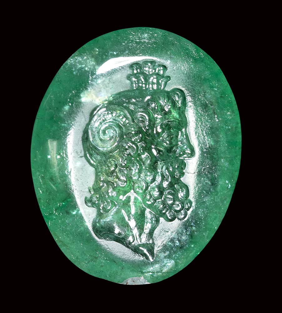 The bearded divinity faces right, and is characterized by a modio (attribute of Jupiter Serapis) and the horns of a ram (attribute of Jupiter Ammon). Usually, this type of combination also more commonly includes the solar rays of Helios, and the staff of Asclepius, all in the same gem. The particularly interesting aspects of this intaglio are the iconography (rare), the extraordinary refined executive style (after a Greek model), and above all the material: the emerald. The stone is large in size, characterized by an exceptional color. The shape is oval, cabochon on the back, while the surface is flatter near the face. Wear marks. Mirror polished. The anatomical details are expertly engraved, just as the modius is engraved with great tecnique. Probably alexandrian workshop. The face shows some interesting physiognomic features, which for some details is very similar to the portraits of the emperor Septimius Severus (the nose, the eye with the thick contours, the thick beard and the curly hair). The presence of the cult of Zeus Serapis is attested in the coeval coinage (Septimius Severus, bronze minted at Nikopolis ad Istrum. between 193-211 AD, REV: NIKOPOL PROC IC, Draped bust of Serapis in modius, facing right). Gold Aureus of Septimius Severus (193-211 C.E.; and a Frontal Portrait of Jupiter Ammon on the Reverse. Rev. IOVI VICTORI Head of Jupiter Ammon facing three-quarters r. C 249. BMC p. 219 note *. Hunterian 91. RIC 272. Calicó 2468.) For the style and subject see also emperor Hadrien drachm, from Egypt. Parallels: G.M.A. Richter, p. 66 n. 262; AGDS, Band III, Gottingen/Kassel, n. 89. BNF Cabinet des Médailles, intaille "Buste de Sérapis-Ammon, inv.58.2021; intaille "Buste de Sérapis-Ammon radié" inv.58.2022; intaille en emeraude, "Jupiter lauré"nv.58.1415bis.