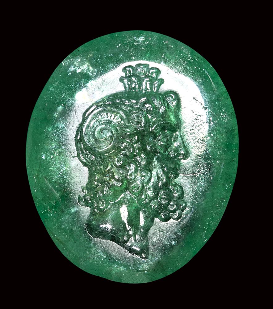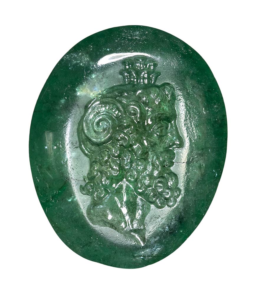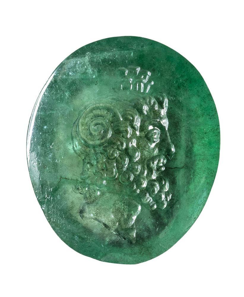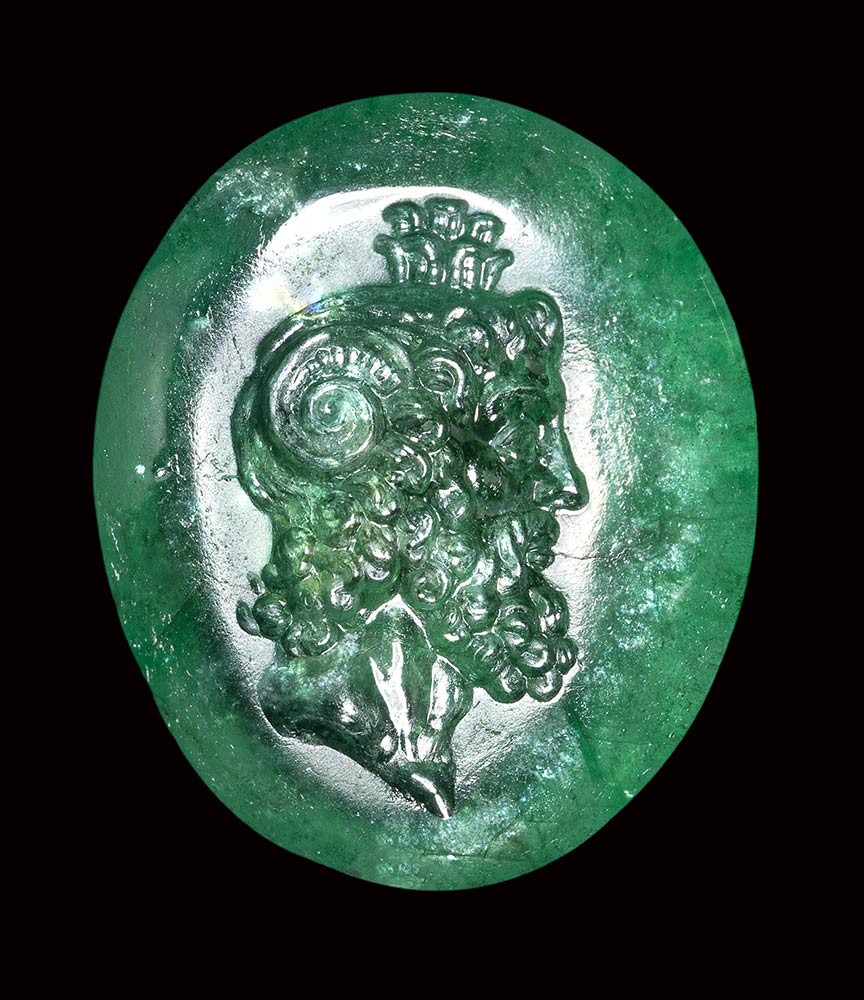 A very fine roman imperial emerald intaglio. Bust of Pantheistic Zeus. <br><br>2nd century A.D.