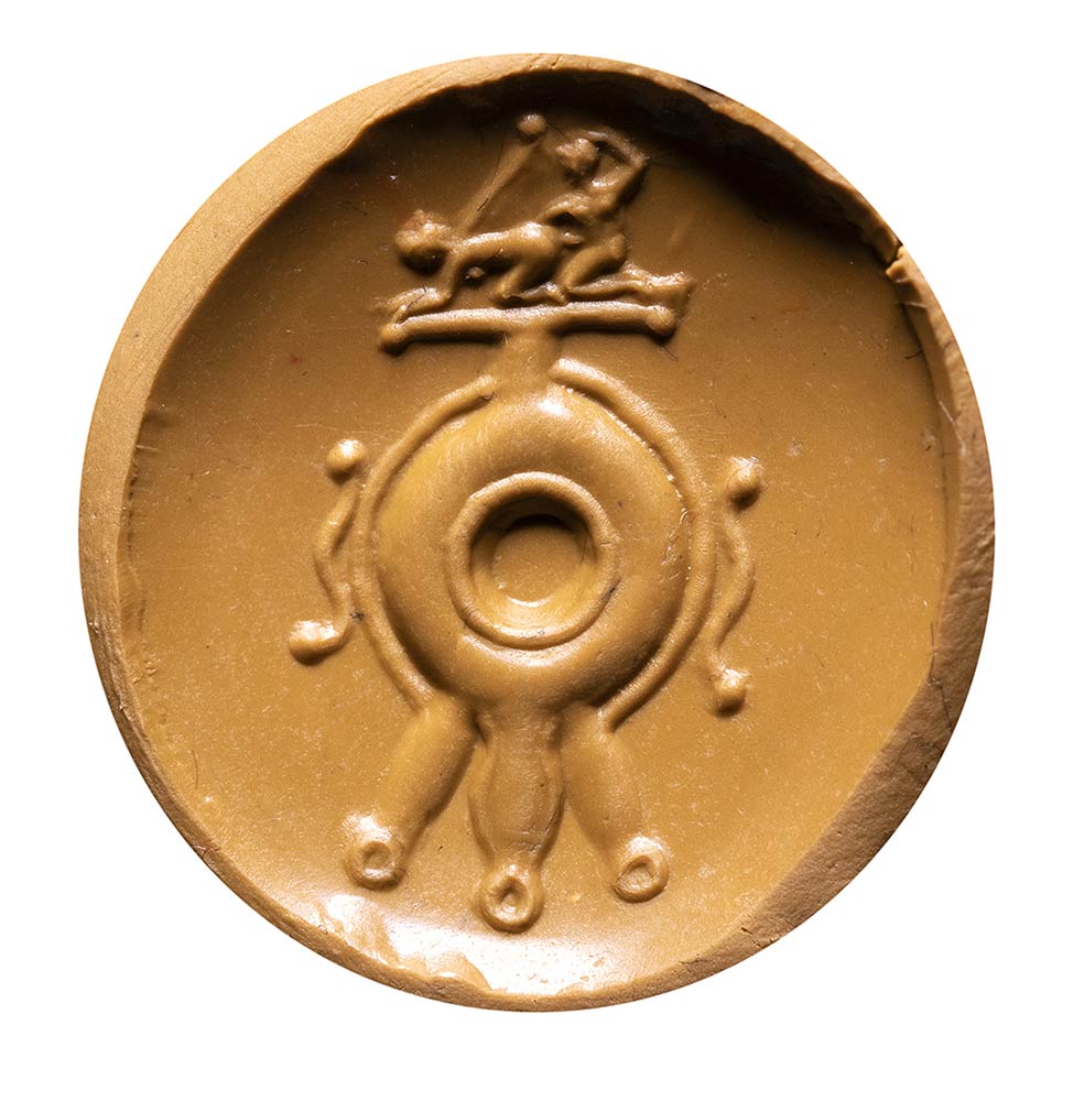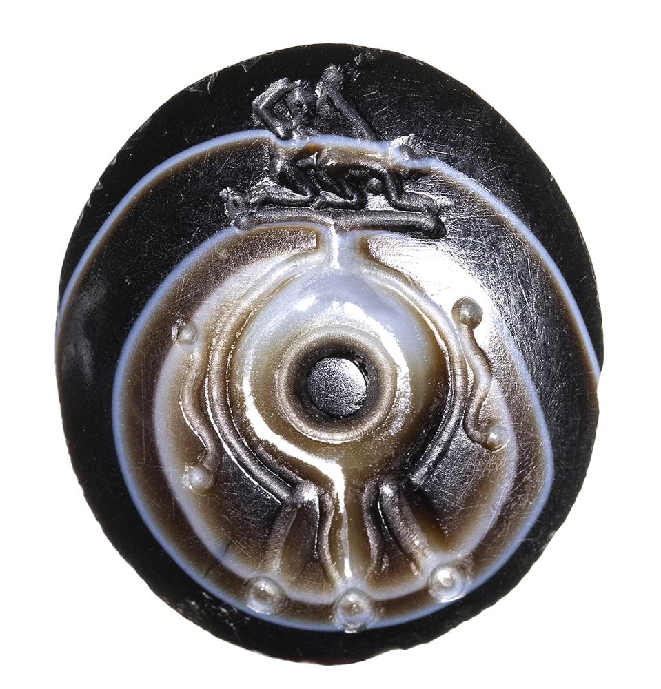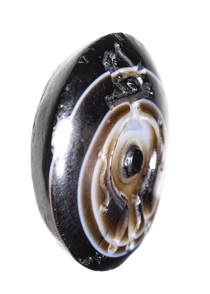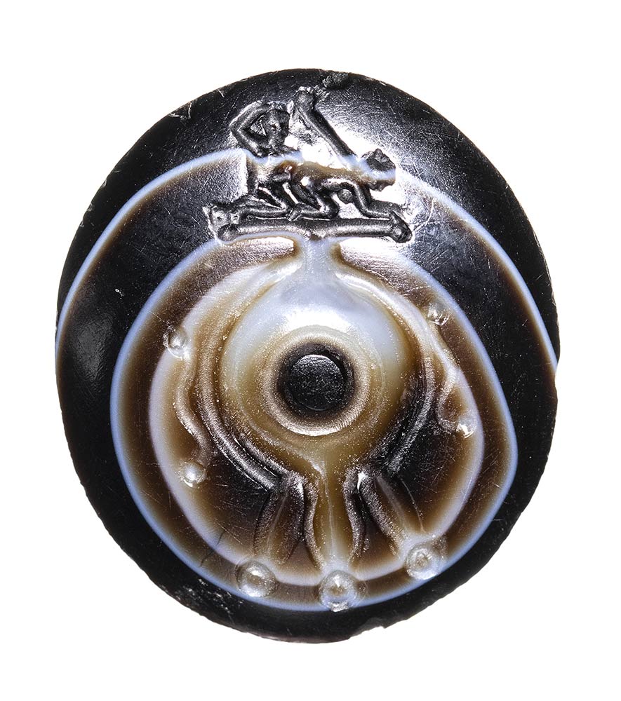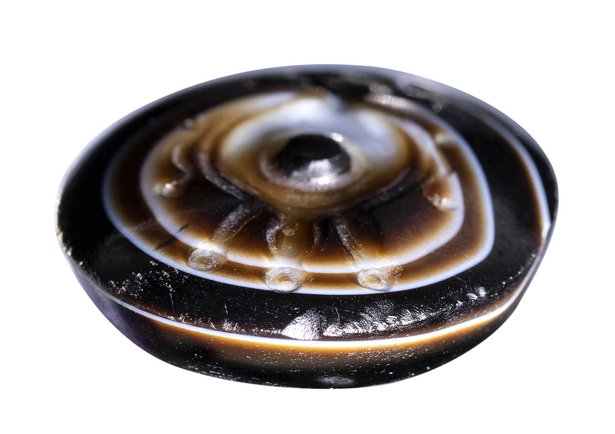 Tricline oil lamp (three "beaks" or "fires") adorned above the handle ("triangular reflector") by an erotic scene: a young man on his knees is intent on penetrating a kneeling woman from behind ("coitus da tergo"). The type of lamp can be traced back to the Julio-Claudian era. Presence of globular elements. Beautiful variety of banded magical eye sardonyx. Wear marks. Parallels: AGDS n. 232; n. 747. AGKM (Kunst, Wien), vol. II, n. 950.