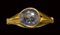 With elliptical hoop , projection below either shoulder ornamented with incised lines. Raised circular bezel with a cabochon blue pale sapphire. Signs of wears and chips on the surface of the stone. Slight missing material on the edge of the box-setting.