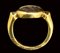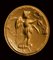 The intaglio depicts a winged Nike standing and turned left. She holds a palm branch and a laurel wreath in her hands. Slight chips and wear marks on the surface of the stone. The later massive gold mounting with elliptical hoop, flatten within is extending with sided shoulders narrowed toward the junction with the rounded bezel.