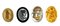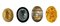 Nicolo 12 x 15 x 2 mm; carnelian 11 x 16 x 2 mm; agate 11 x 13 x 2 mm; banded agate 11 x 16 x 2 mm.