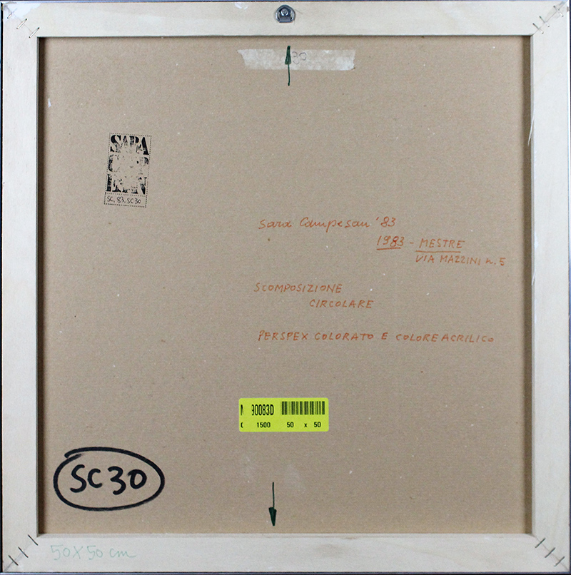 SARA CAMPESAN, "Scomposizione circolare", 1983, Perspex colorato e colore acrilico, Dim. 50x50, Opera archiviata al N°SC83SC30 presso l'archivio "Sara Campesan", Al verso: titolato, datato e firmato