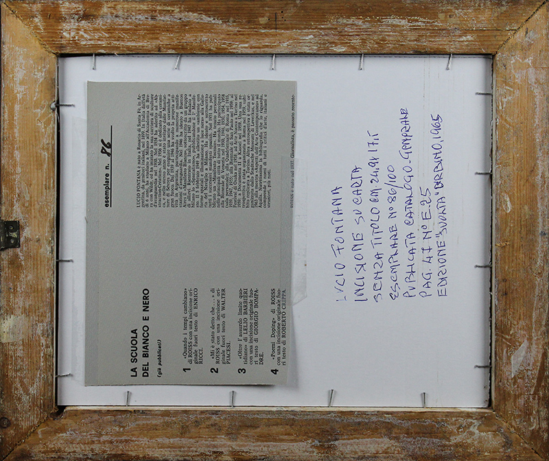 LUCIO FONTANA, Senza titolo, 1965, Incisione su carta, Dim. 24,9x17,5, Opera pubblicata su catalogo generale a pag. 47 n° E.25, Edizione "Svolta" Urbino 1965, Al fronte: esemplare n° 86/100 in basso a sinistra e firmato in basso a destra, Opera con cornice
