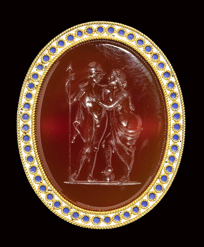 A fine neoclassical carnelian intaglio set in an gold and enamel mounting . Mars and Venus.