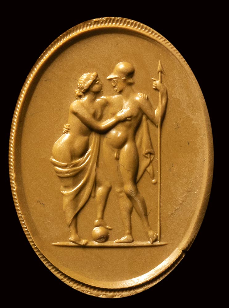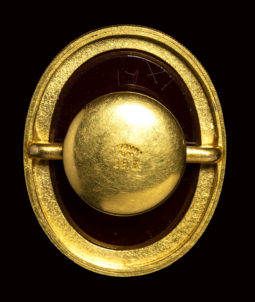Venus is caressing the helmeted Mars, the god of the War, who wants to depart, armed with his spear. Several statuary groups depict “Venus detaining Mars from the Wars”, similar to that intaglio engraved in a deep red carnelian. The examples found in neoclassical art are after ancient roman versions. The marble group from Ostia (in the Museo Nazionale Romano), and the one in the Louvre are both roman copies after lost greek original, mixing the types of the Ares Borghese and of the Aphrodite of Capua. This intaglio could be a neoclassical version of earlier gems. Almost identical gems were cast by Tassie: three are inverted (n. 6514-6516), one is in the same direction but heads are further apart (n. 6517), one in green chalcedony (n. 6518) and a lost one is in jasper (n.6519). A terminus post-quem for the original design is given by the gem once owned by Claude de Boudaloue (d. 1715), possibly the one later copied by William Brown. This carnelian intaglio is set in an elegant cuff-button, 1860’s marked TIFFANY & CO 18ct on the reverse. The gold mount is bordered with twisted wirework, applied with opaque white enamel decorated with circular opaque royal blue enameled motif surrounded by twisted wirework. Tiffany & Co had a collection of antique gems in addition to its stock of contemporary examples.