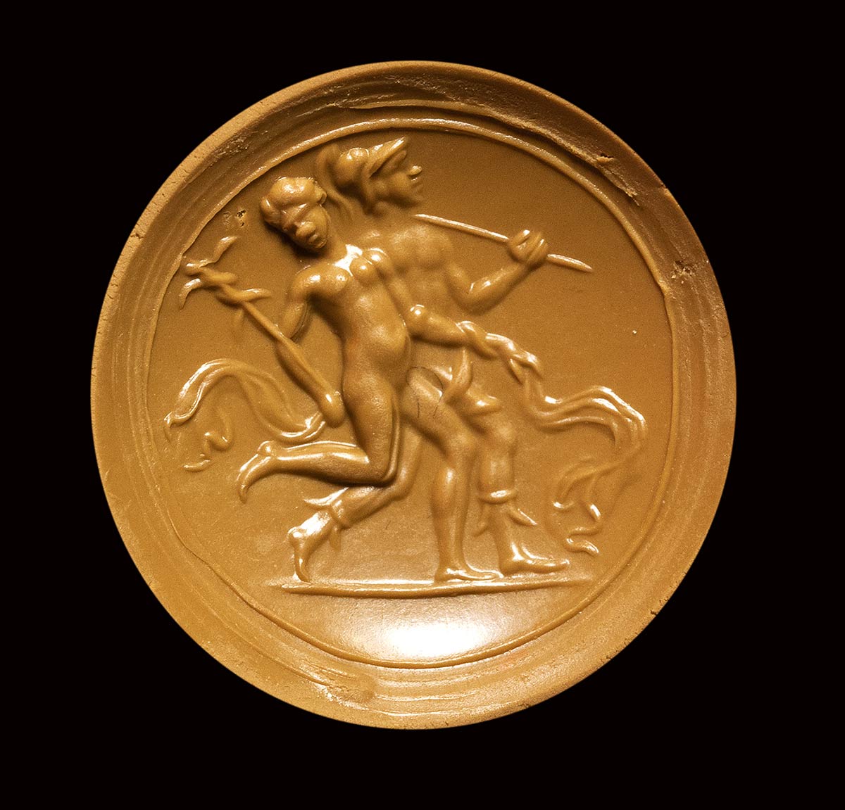 In the foreground, a naked female figure holding a scepter with snakes and a fluttering cloak; in the background, a naked, helmeted male figure advances with a spear. The male character wears military shoes (Mars?). Groundline. Allegorical scene, engraved in the center of an attractive magic eye on two-layered agate.