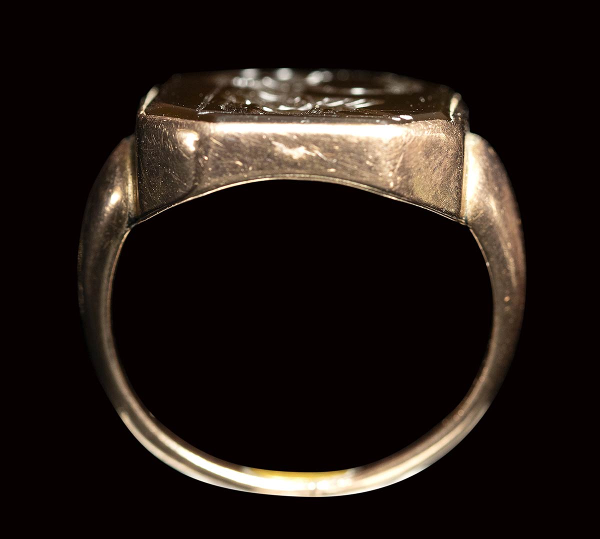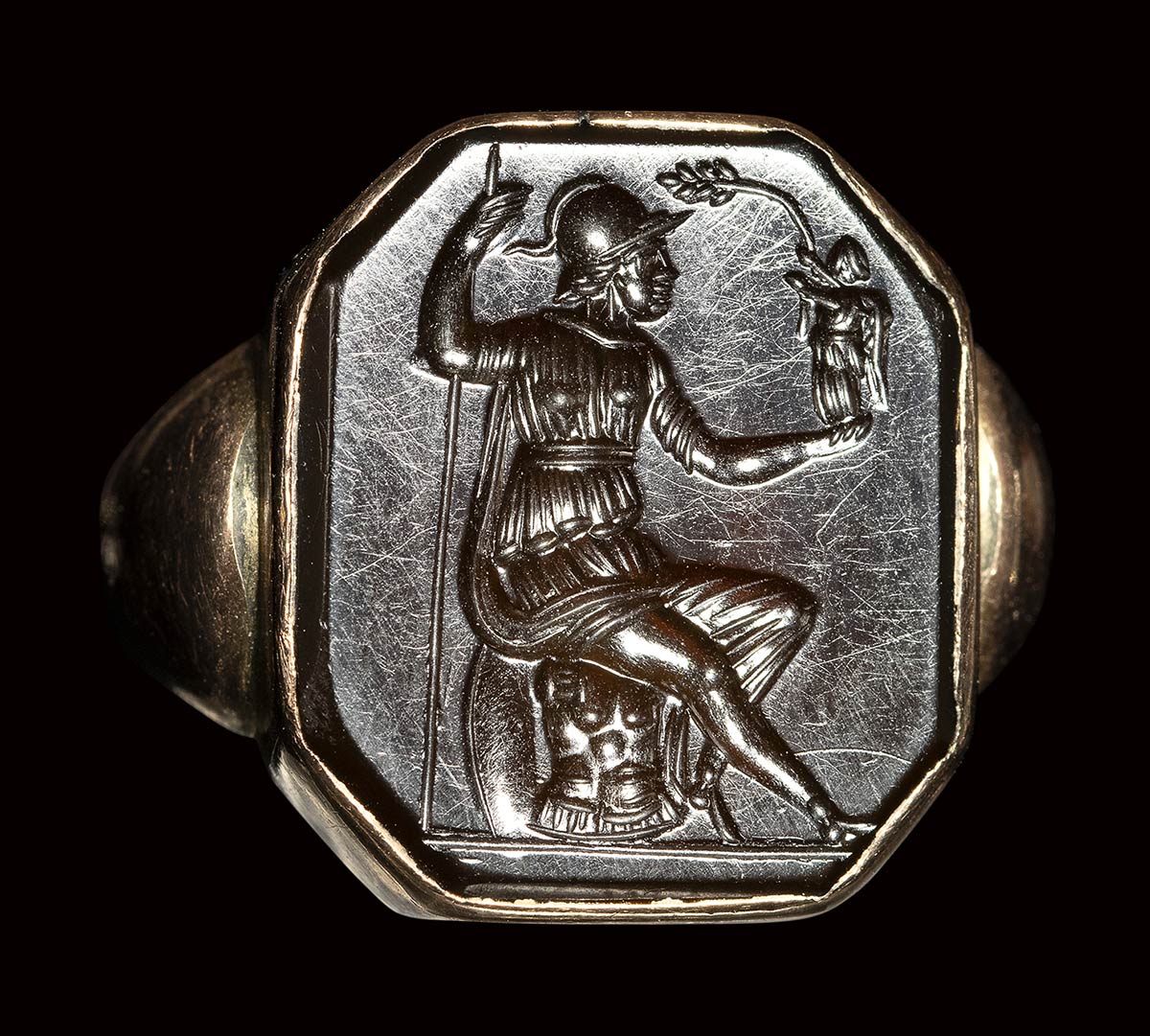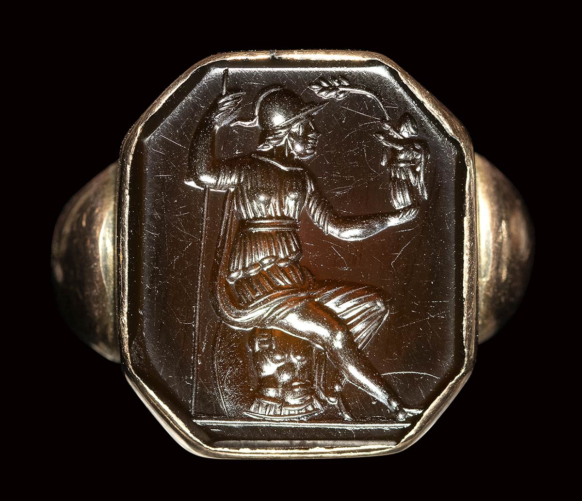 An octagonal sard intaglio set in a gold ring. Athena.<br><br>18th - 19th century.