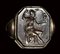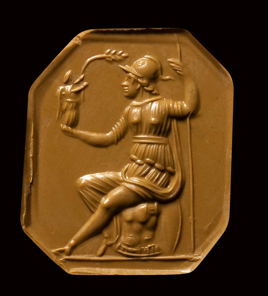 The deity is seated on a panoply (shield and armor), and is facing right. With his right hand she holds the spear, with the left she holds a winged victory offering her a laurel frond. Groundline. Interesting stylized Georgian intaglio. Very good condition.