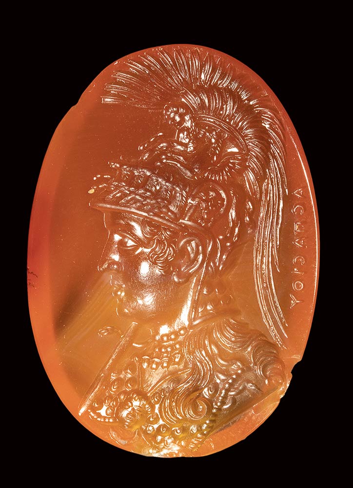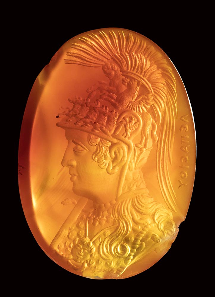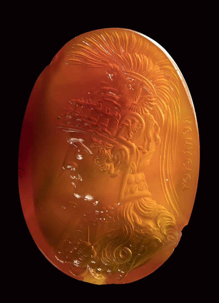 A large carnelian intaglio signed Aspasios. Bust of Athena Parthenos.