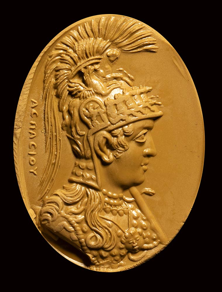 Bust of Athena Parthenos facing left. The effigy is certainly inspired by the famous ancient stone engraved with the same subject and signed by the roman gem engraver Aspasios (red jasper, Rome, Palazzo Massimo National Roman Museum). However, the physiognomic features of the face are not idealized but instead refer to an historical private portrait: the features of the profile recall Catherine II of Russia. The helmet, the hair, the gorgoneion are engraved with great technical mastery. The spear rests on the shoulder. In the field, the signature in Greek of Aspasios. Beautiful vivid color of the gem. Small chip on the edge.