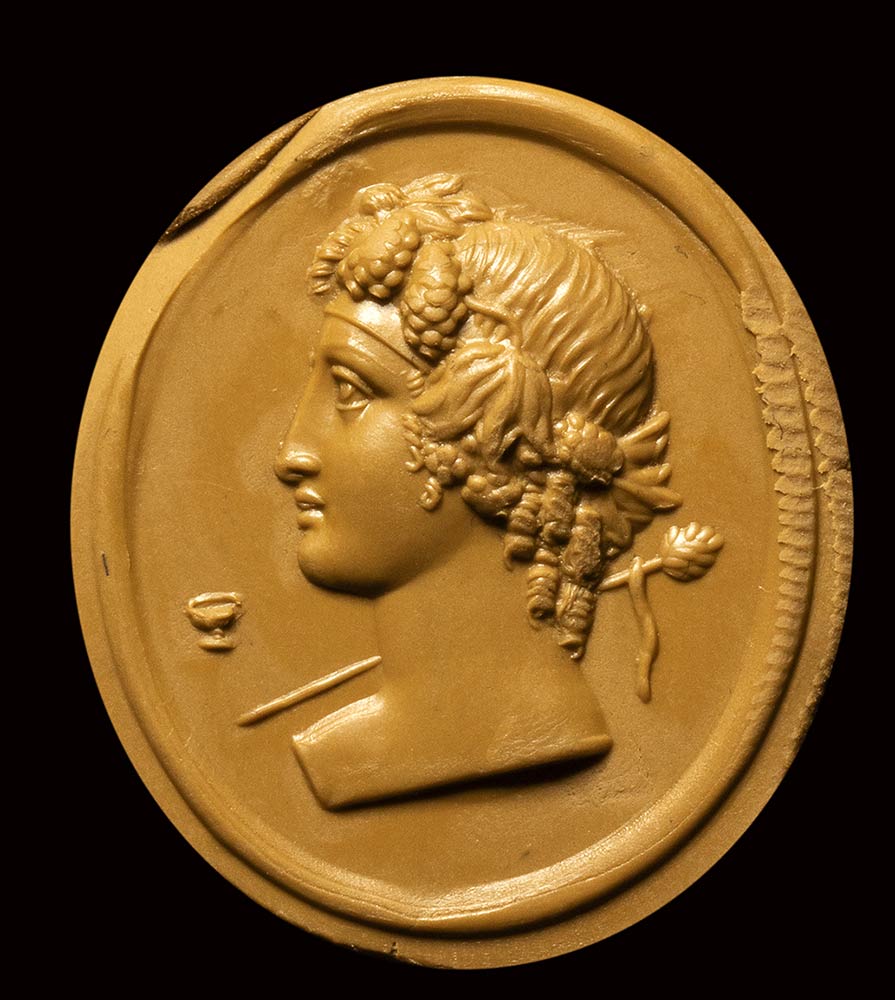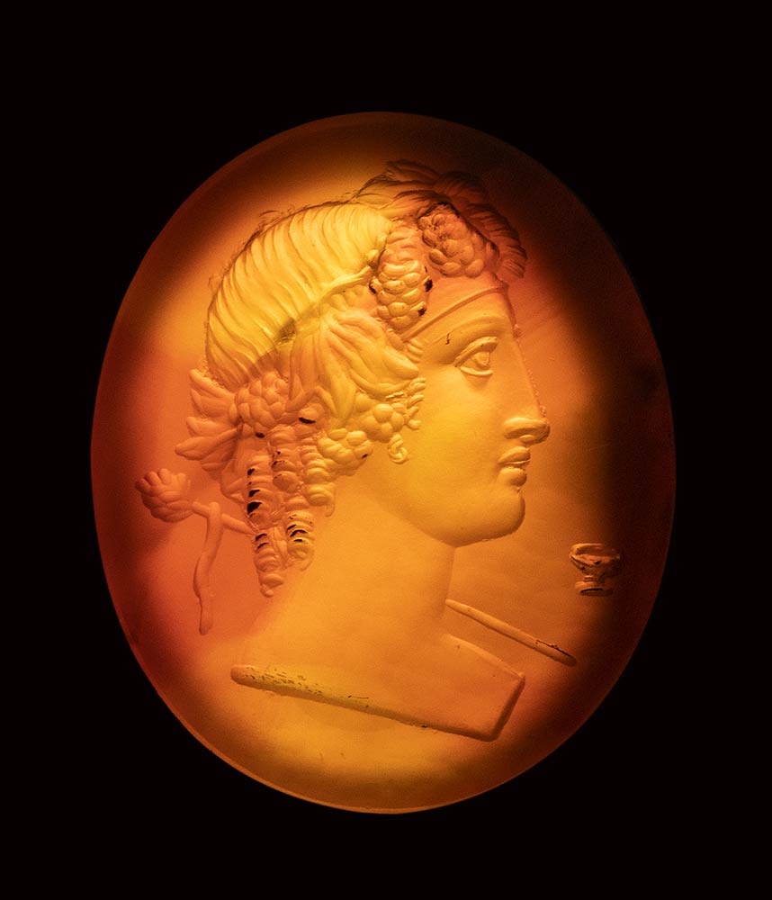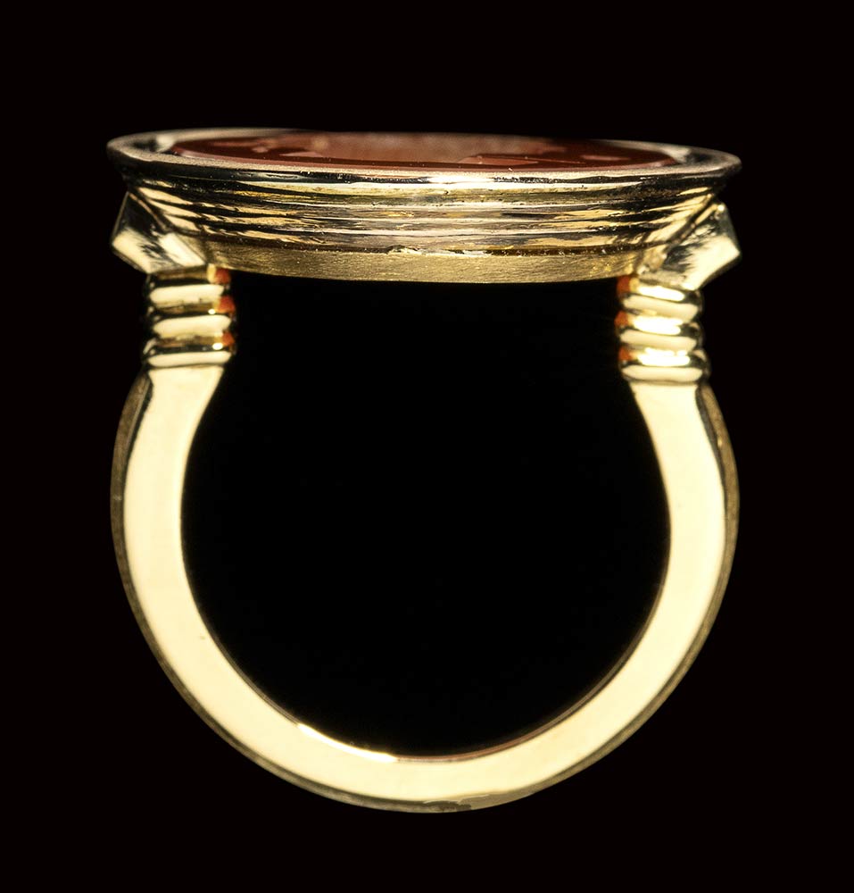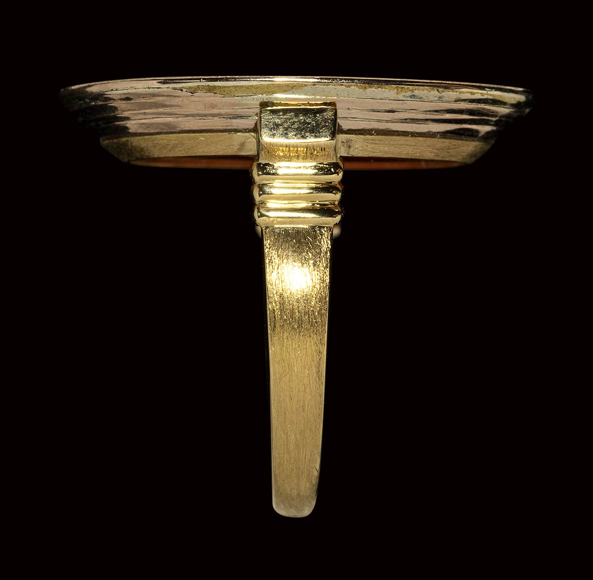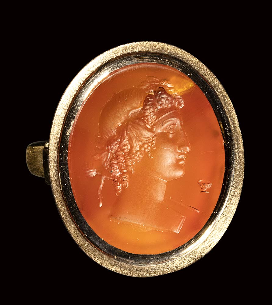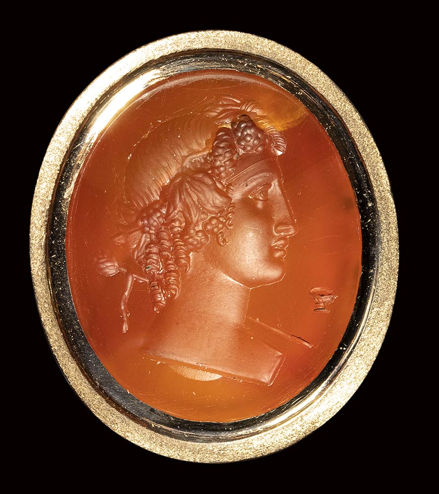 The bacchante is depicted in profile facing right, with a naked bust and hair adorned with bunches of grapes. In the background her attributes: the thyrsus and a small cup for wine. The profile is linear in the typical neoclassical style. Attractive color of the stone. The gem is set in an older gold frame from a seal readjusted into a modern ring. Very good condition.