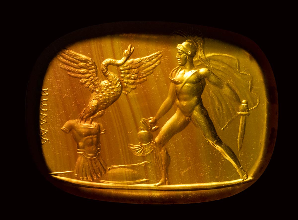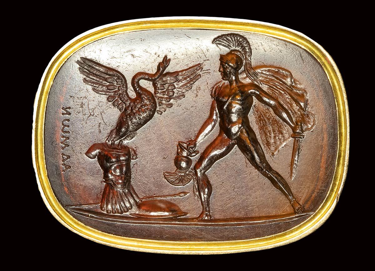 The hero strips Cycnus of his armor, which is transformed into a swan. Achilles faces left, holding the sword and helmet of Cycnus, flying off his armor. Extraordinary scene of metamorphosis from te Ovid’s Metamorphosis. In the field, the signature: ΑΔΜΟΝ.