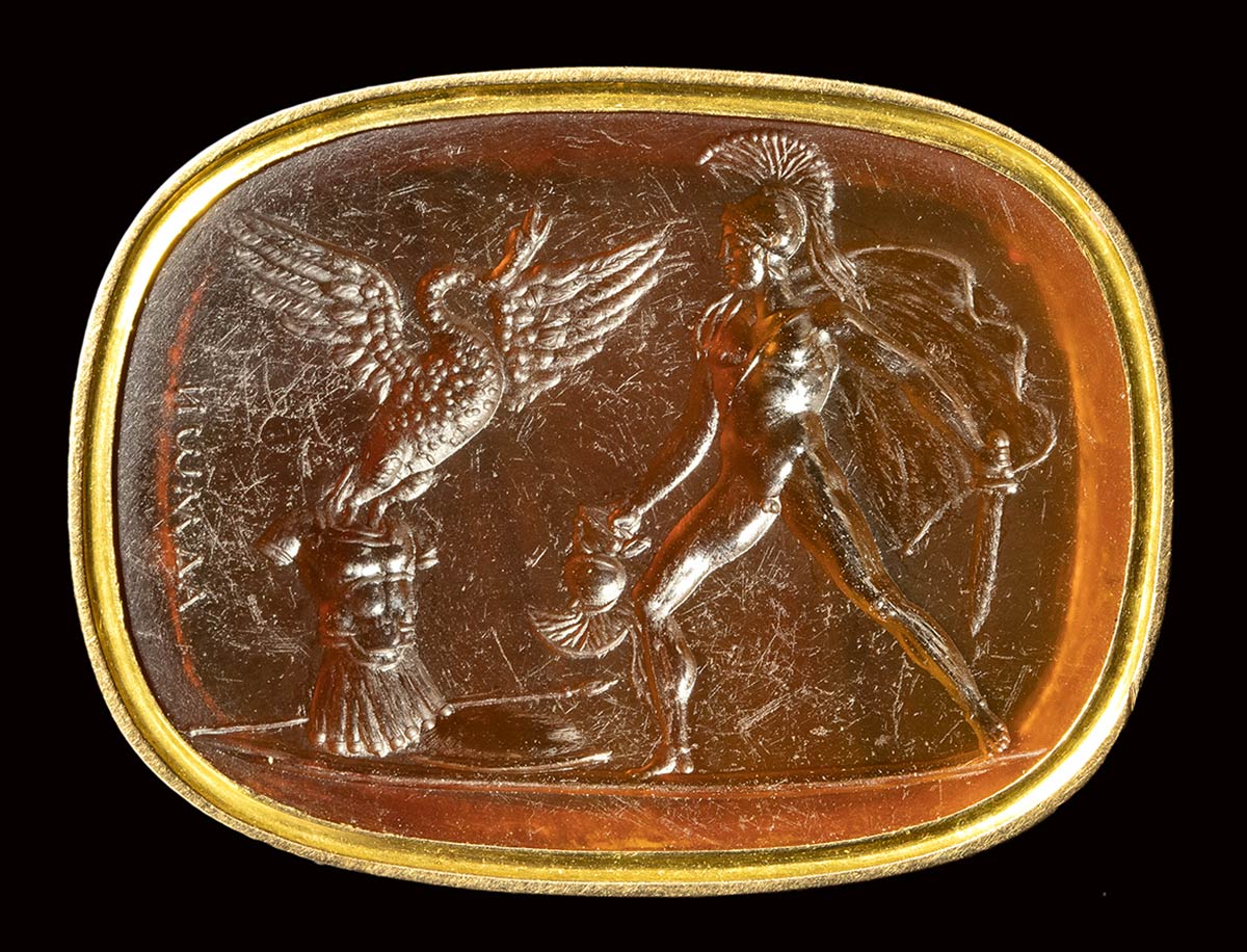 A fine neoclassical Poniatowski carnelian intaglio signed Admon, set in a gold frame. Achilles and the metamorphosis of Cycnus.