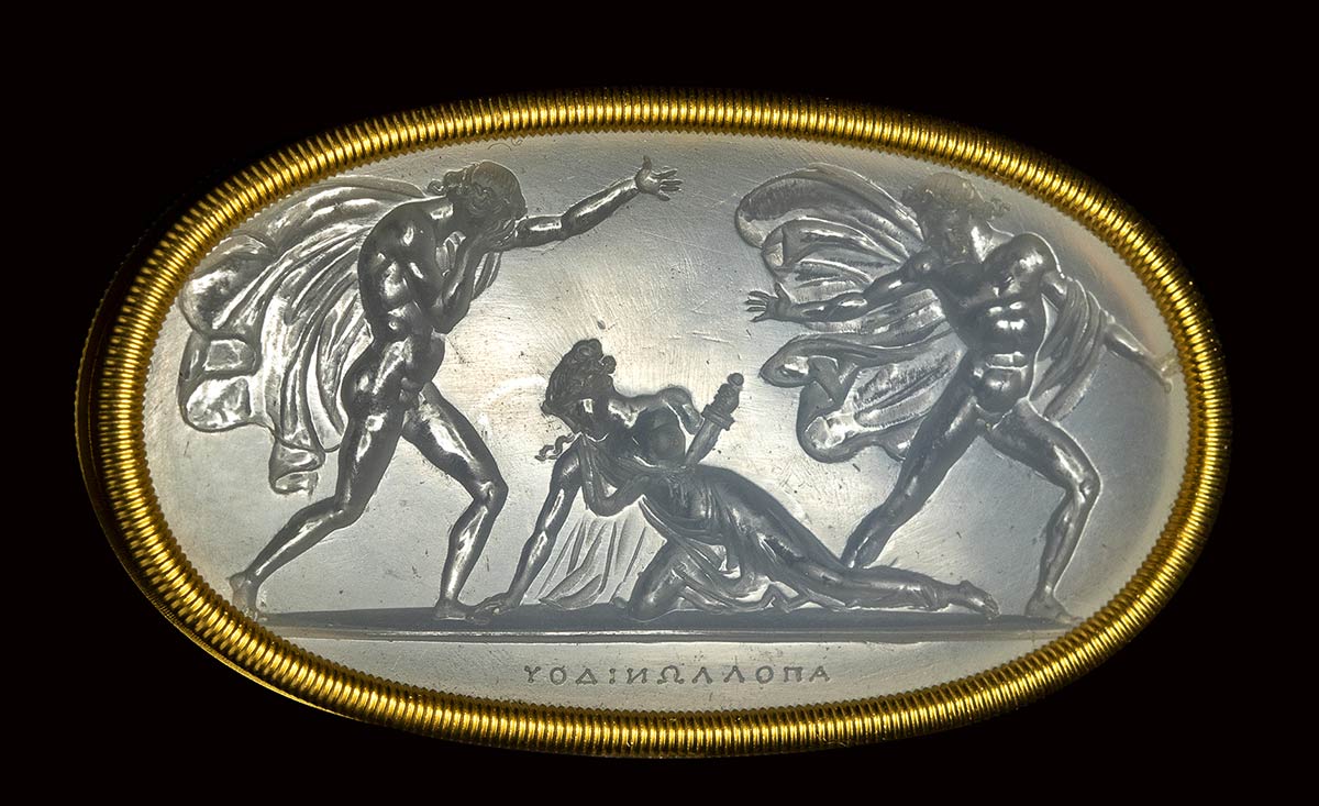 Pelopea killing herself in the presence of Thyestes and Aegisthus. The woman is reclining on the ground, dying, piercing her side with the sword. Beside her, Thyestes and Aegisthus are desperate and raise their arms in shock, their cloaks lifting into the air. Dramatic scene of great expressive power. Beautiful symmetrical composition. The signature: ΑΠΟΛΛΟΝΙΔΟΥ. The intaglio is performed on a splendid chalcedony mounted in a 19th century gold frame.