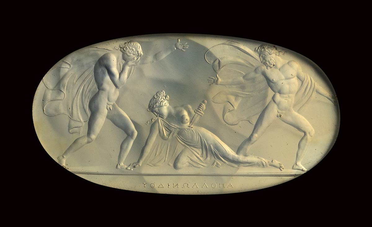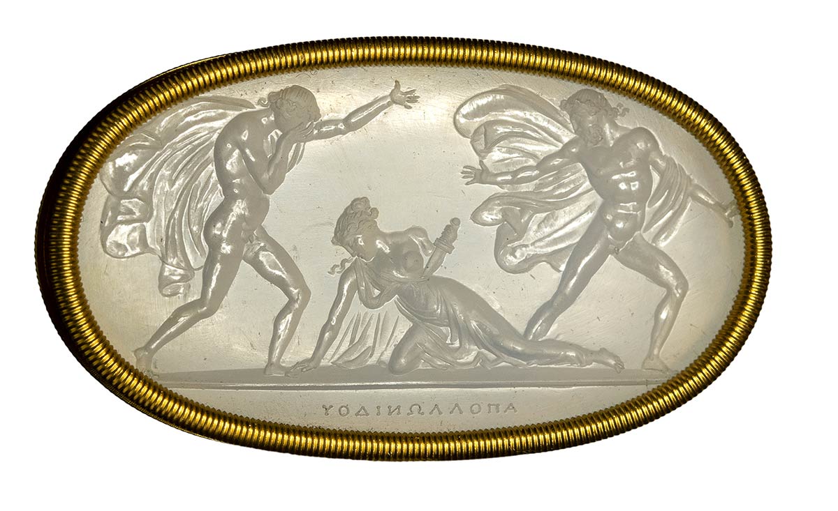 A fine neoclassical Poniatowski chalcedony intaglio signed Apollonides, set in a gold frame. Pelopea killing herself with Thyestes and Aegisthus. 19th century.