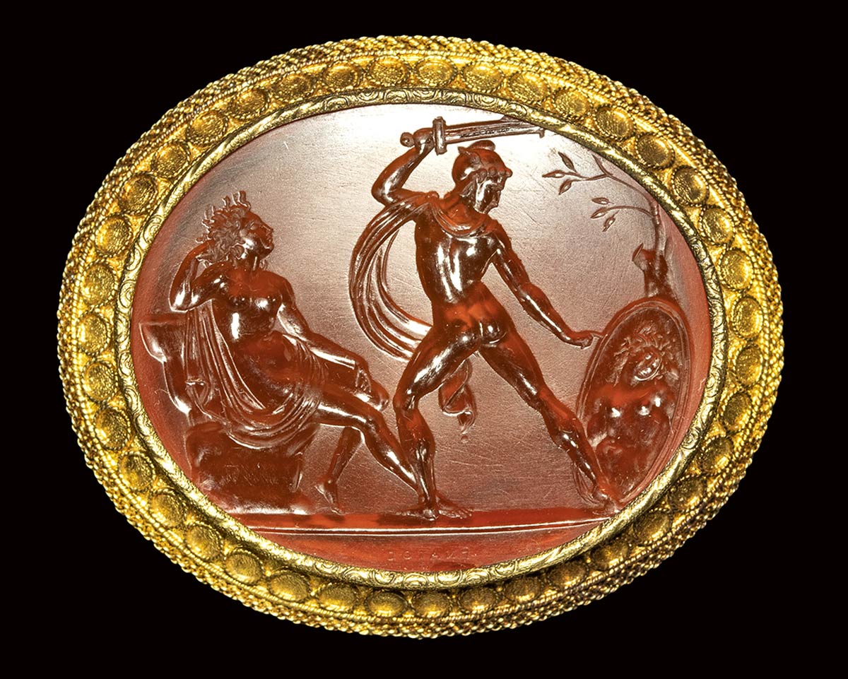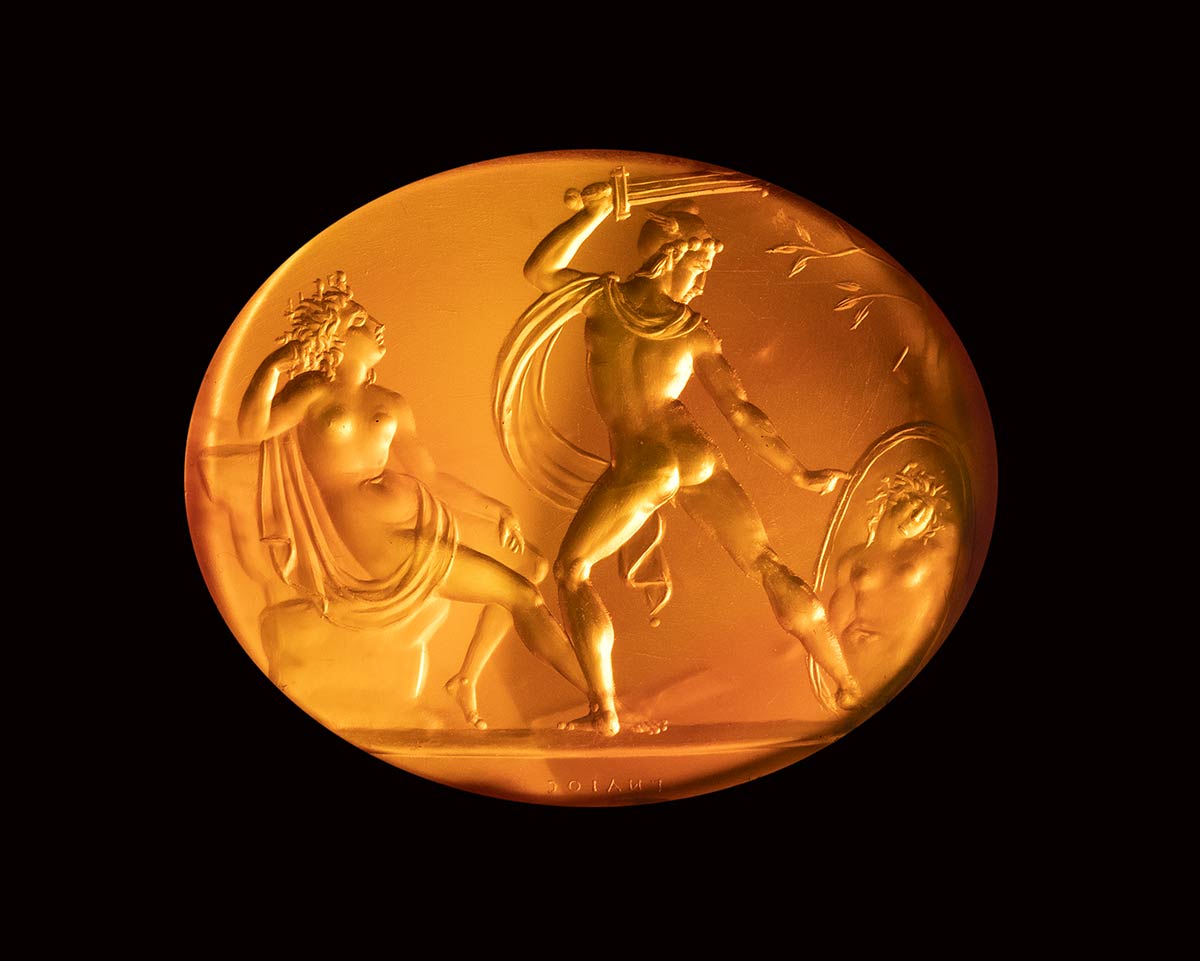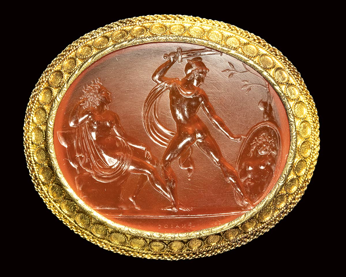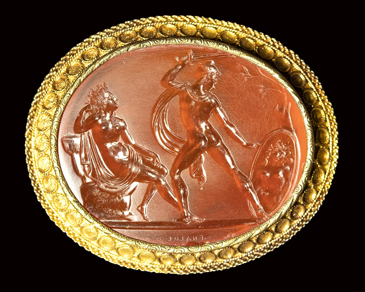 Might it be that a second version, or the original model, of that intaglio? In this unpublished version, the style and the executive technique are superior and the composition slightly different from the drawing for some variants. Here the hero stands in the center of the scene, facing left to decapitate Medusa asleep on top of the rocks; however, in the act of raising his sword, he looks back at his monstrous reflection in the shield, not to be petrified by his fatal gaze. The signature: ΓΝΑΙΟΣ. Probably by Calandrelli. Very fine gold setting, dating from the 19th century.
