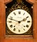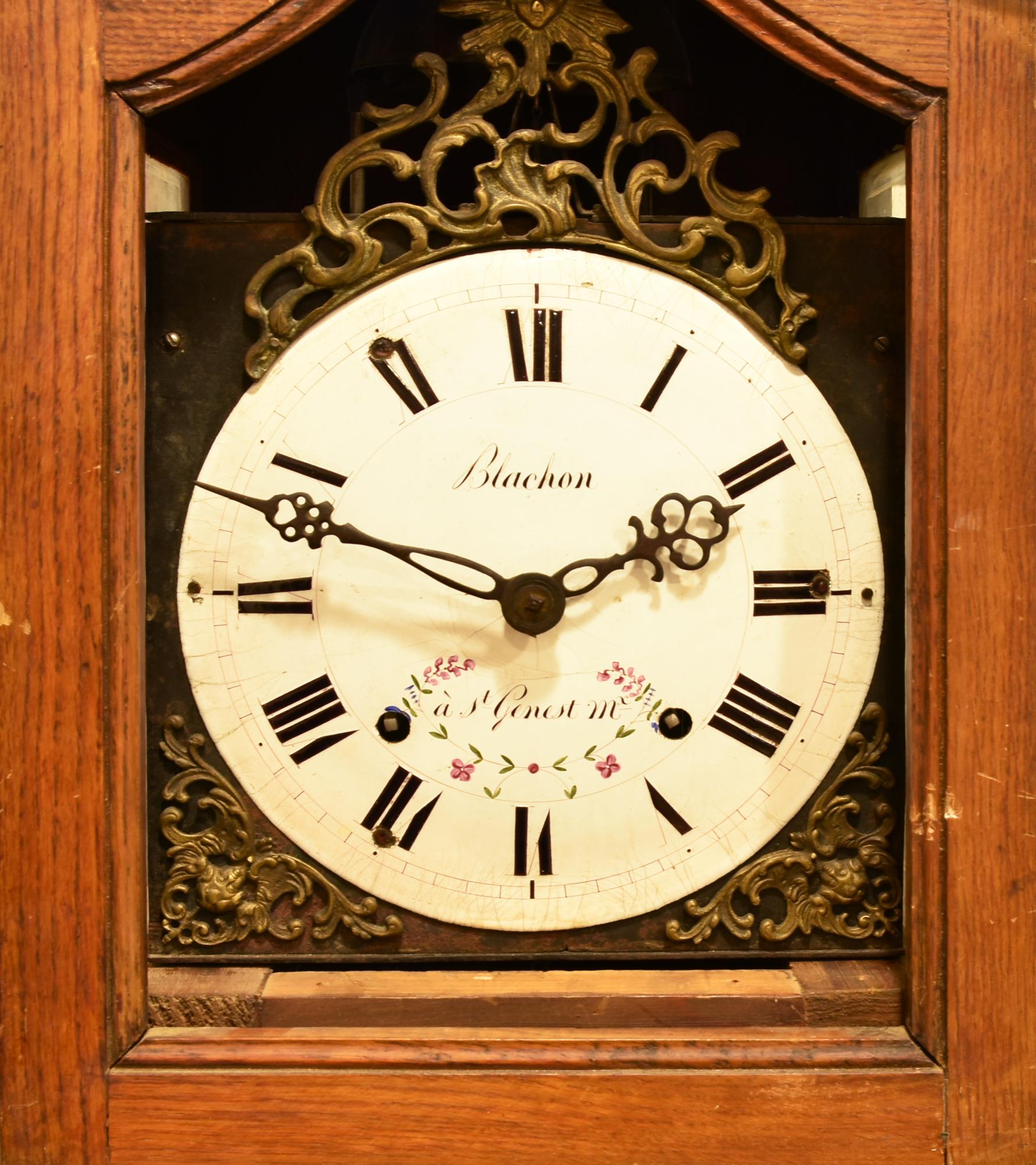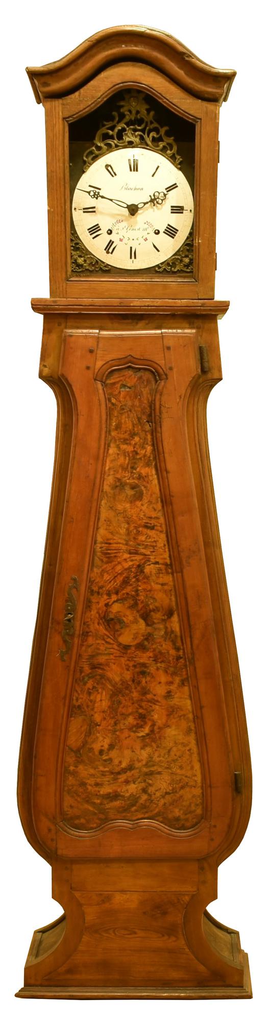 movimento Morbier con scappamento a verga, suoneria delle ore e delle mezze su campana in bronzo, quadrante in smalto con numerazione romana sormontato da fregio in ottone con sole, firmato Blachon a Saint Genest Malifaux, cassa di forma in legno di quercia pannellato con legni e radiche di varie essenze.
