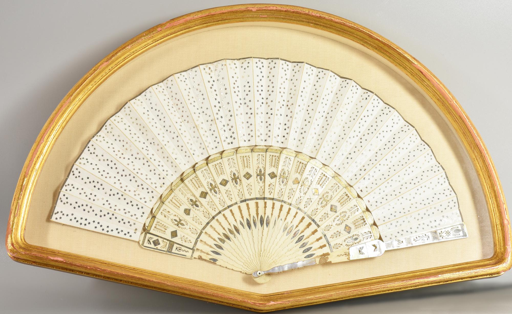 VENTAGLIO in avoriolina e carta finemente decorato, cm 50x26 Venezia, seconda...