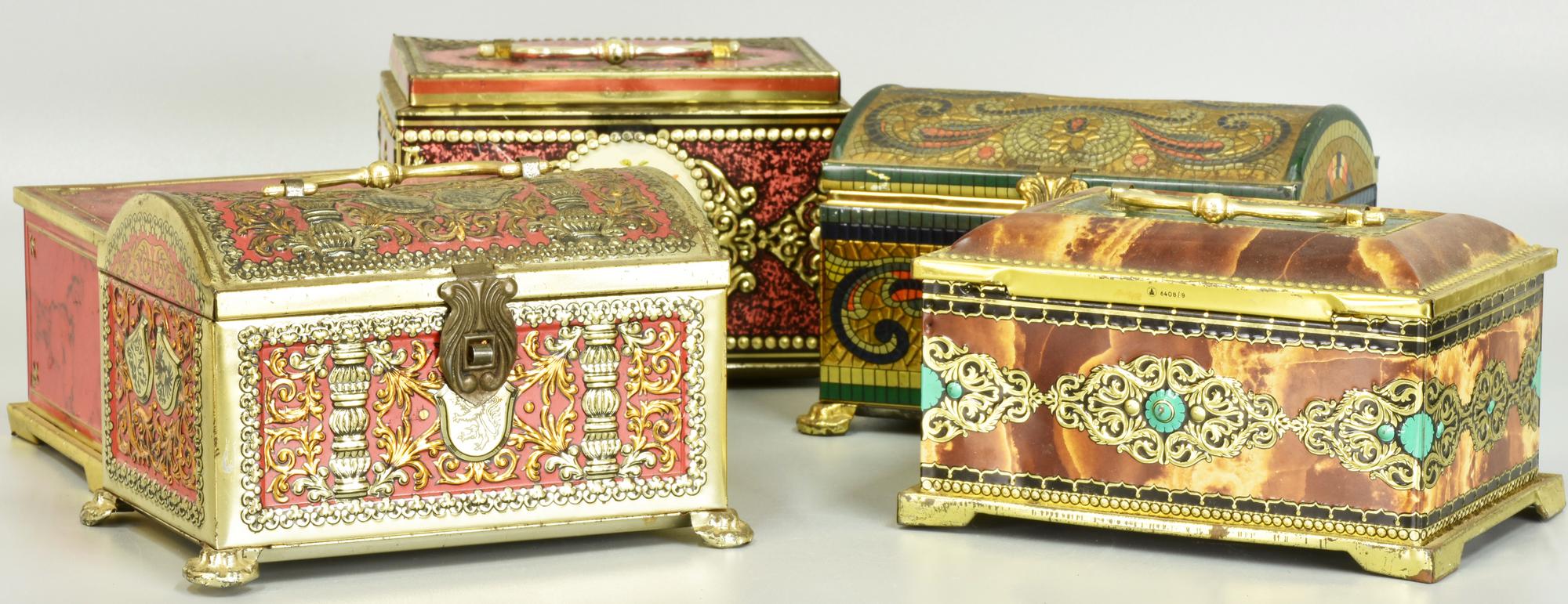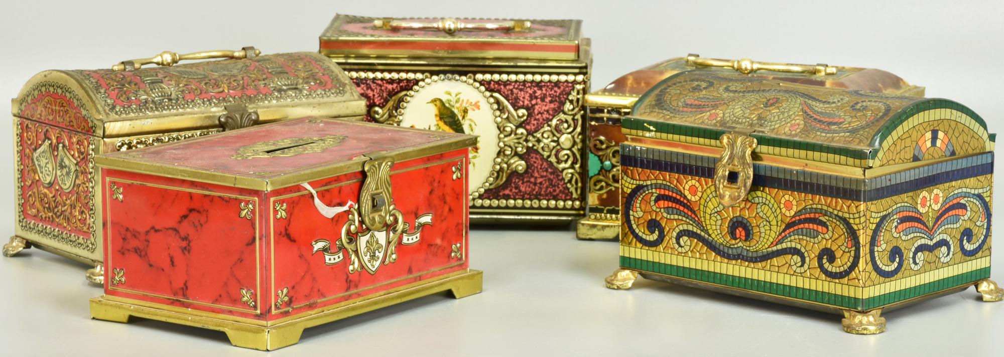 LOTTO DI 5 SALVADANAI IN LATTA finemente decorati ca cm 10x11 Difetti