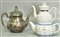 LOTTO DI TRE TEIERE in peltro e ceramica, h da cm 11 a 21 Difetti