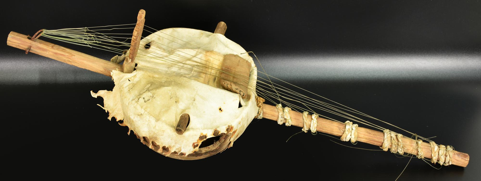 strumento musicale a corda in legno, frutto e pelle di pecora