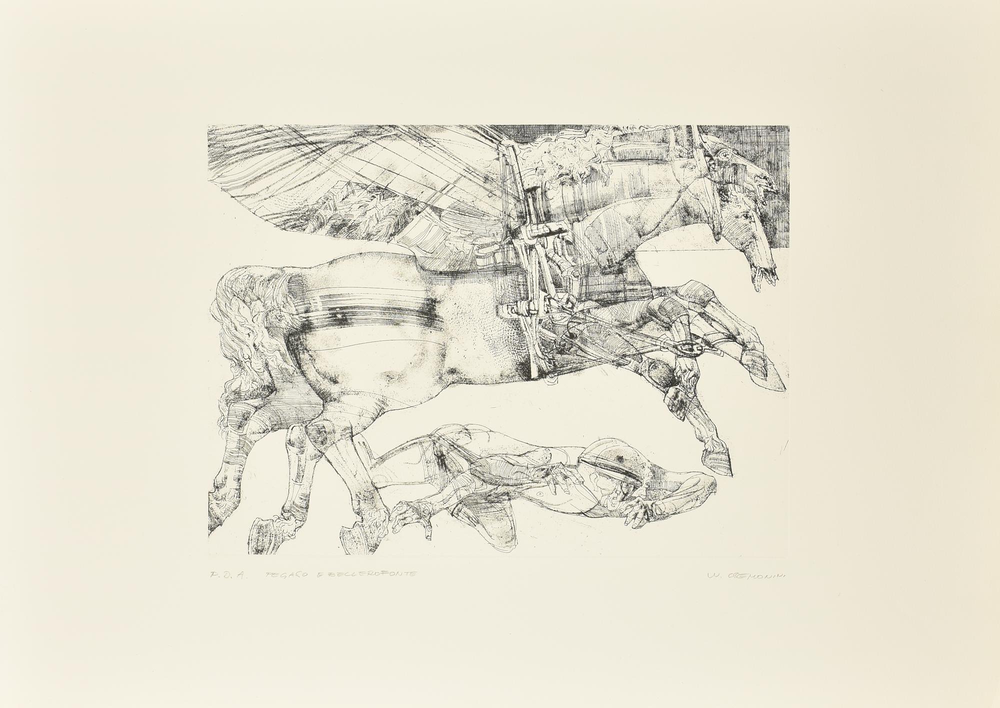 Walter Cremonini PEGASO E BELLEROFONTE incisione su carta, battuta cm 30x40,...