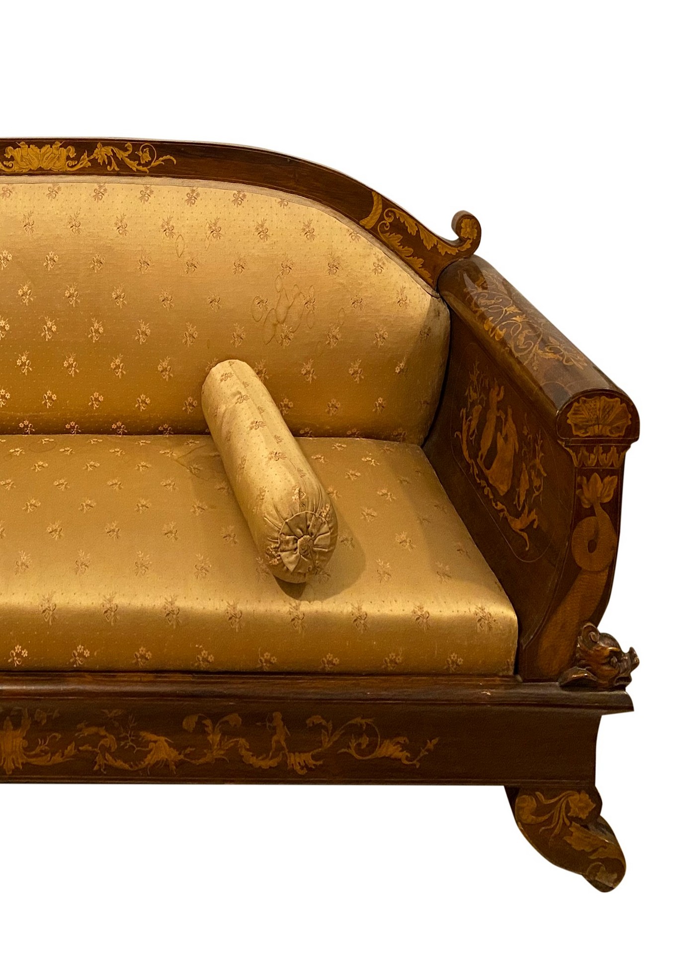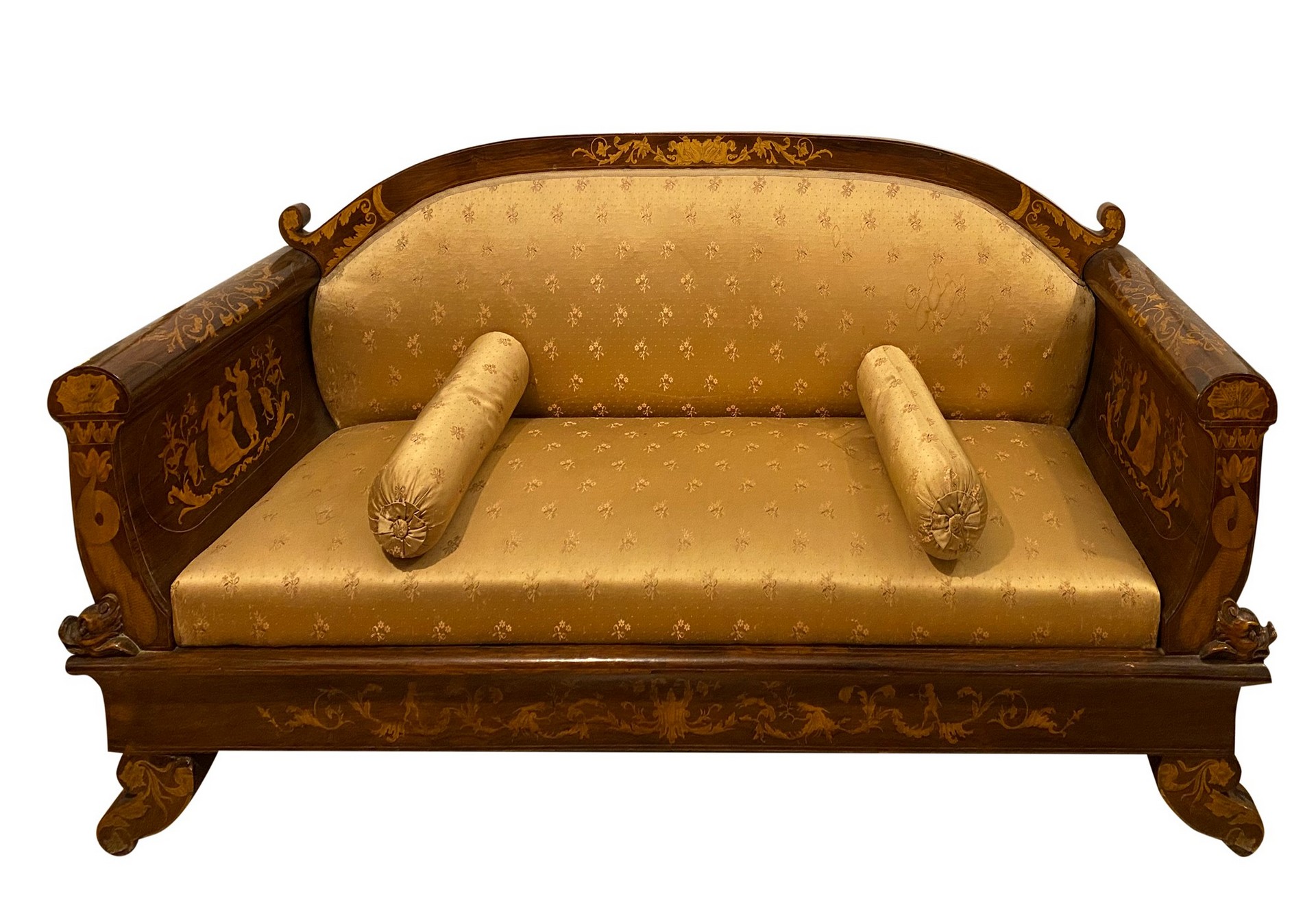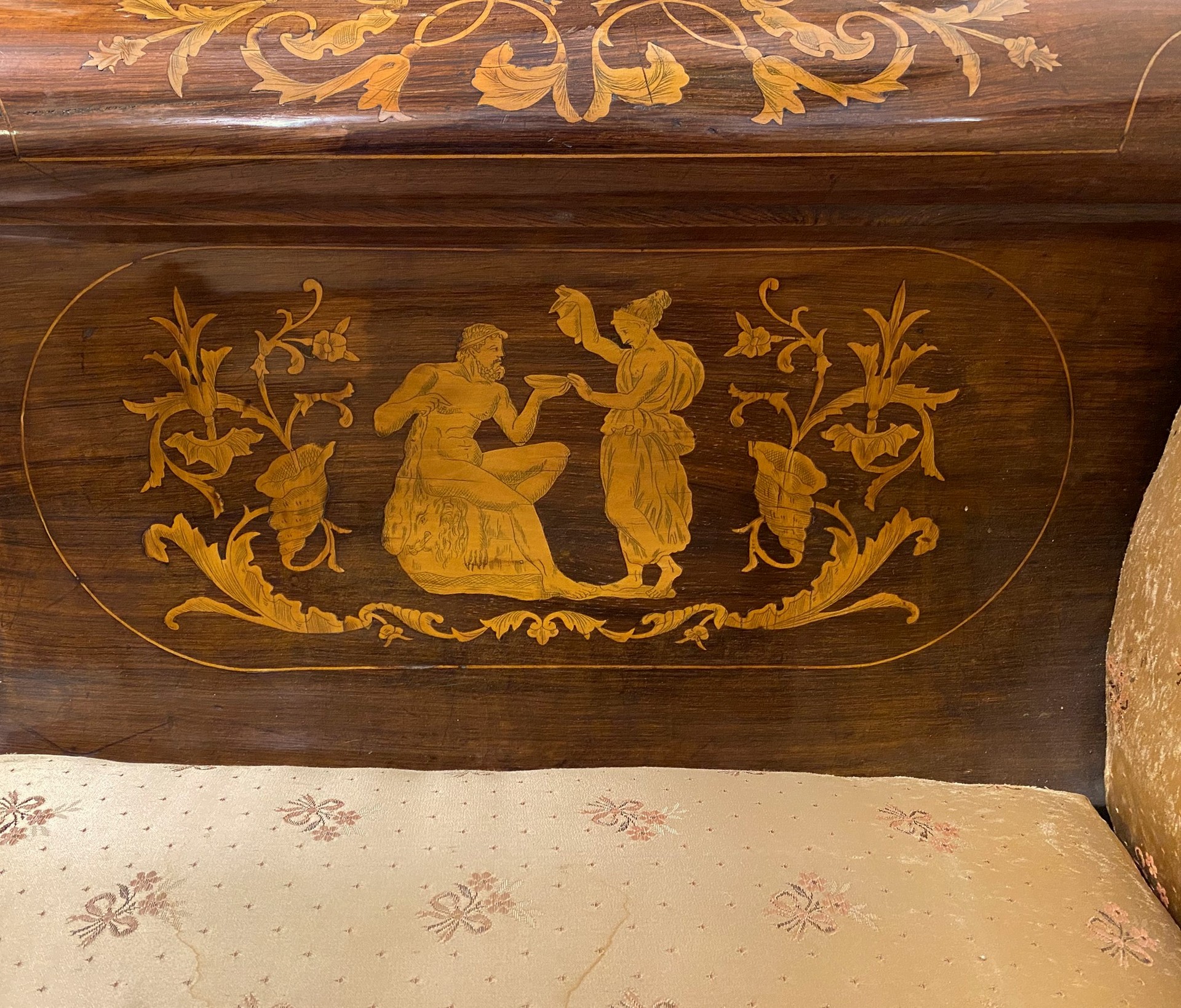 Divano Carlo X, Inizi 19° secolo 230x65 cm H 90 Intarsi con scene neoclassiche e festoni a larghe foglie in legni chiari