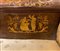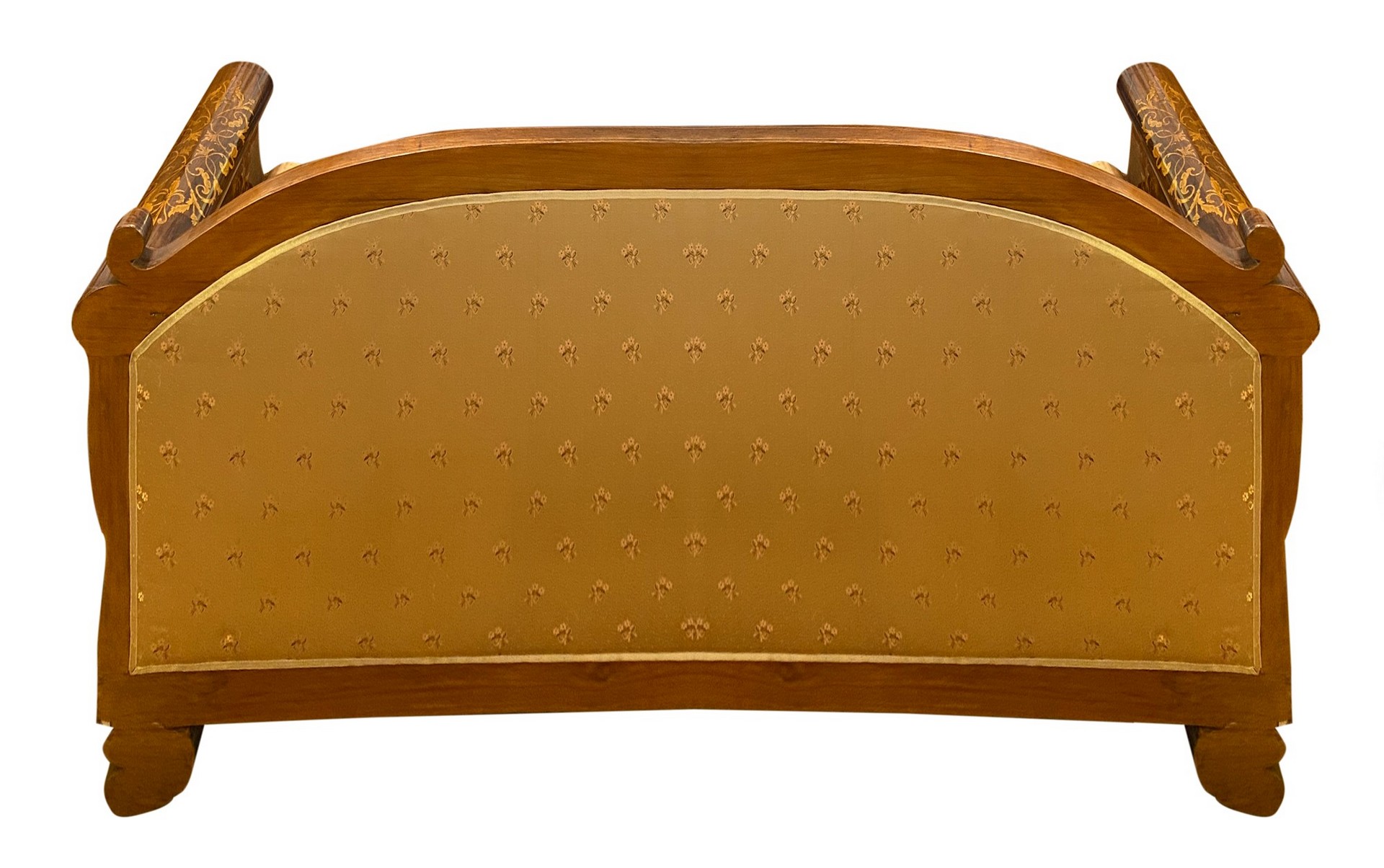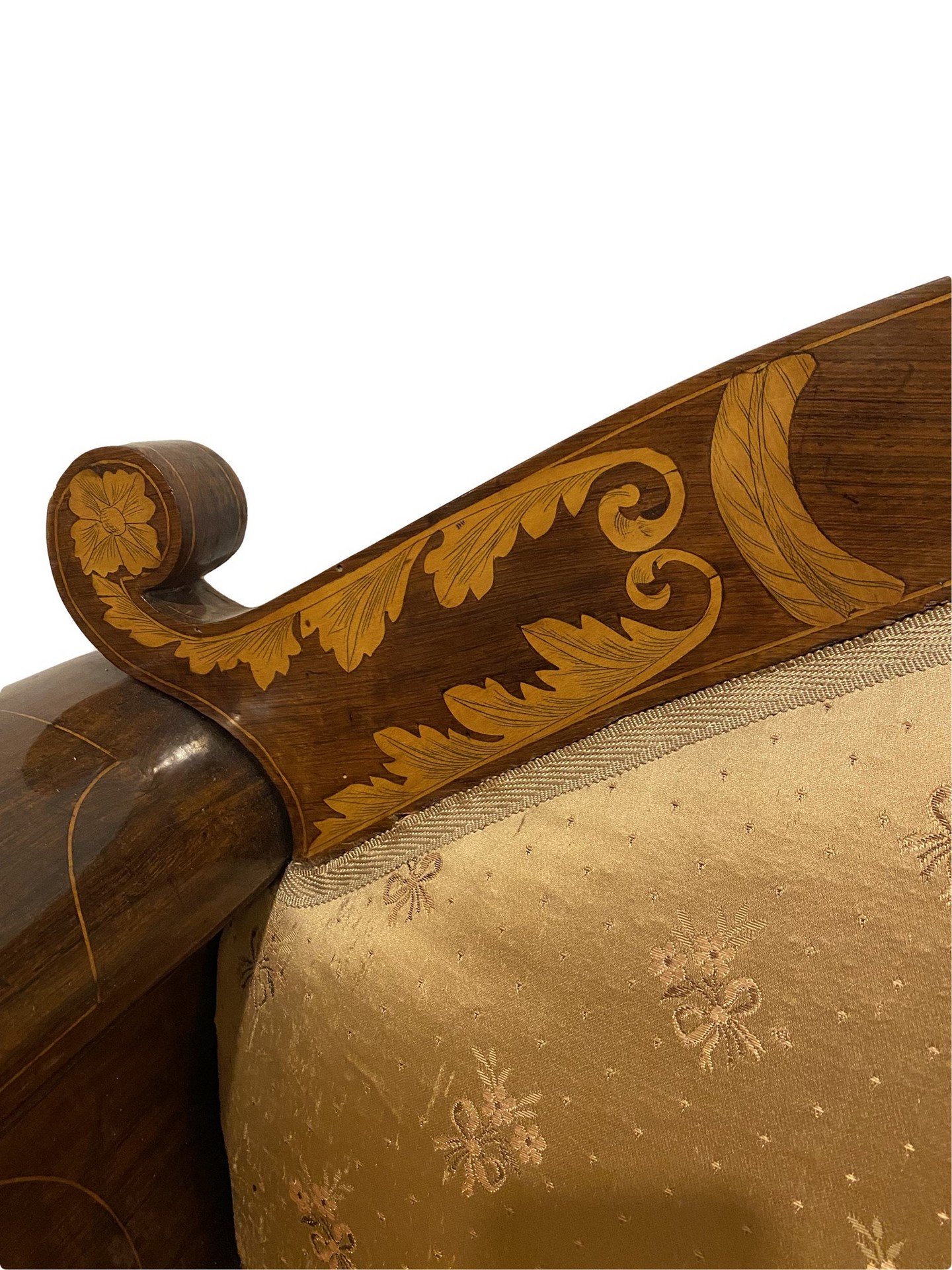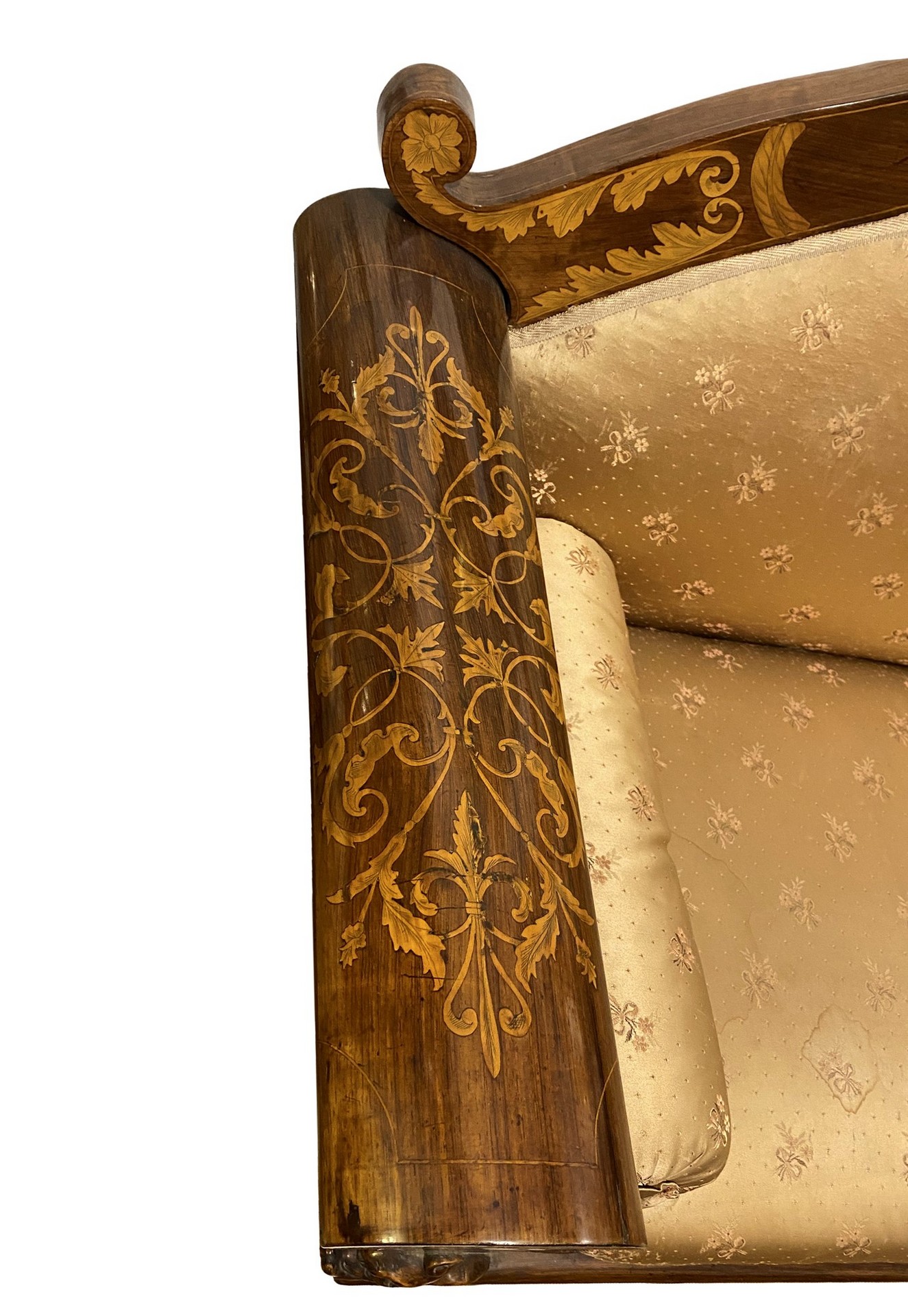 Divano Carlo X, Inizi 19° secolo 230x65 cm H 90 Intarsi con scene neoclassiche e festoni a larghe foglie in legni chiari